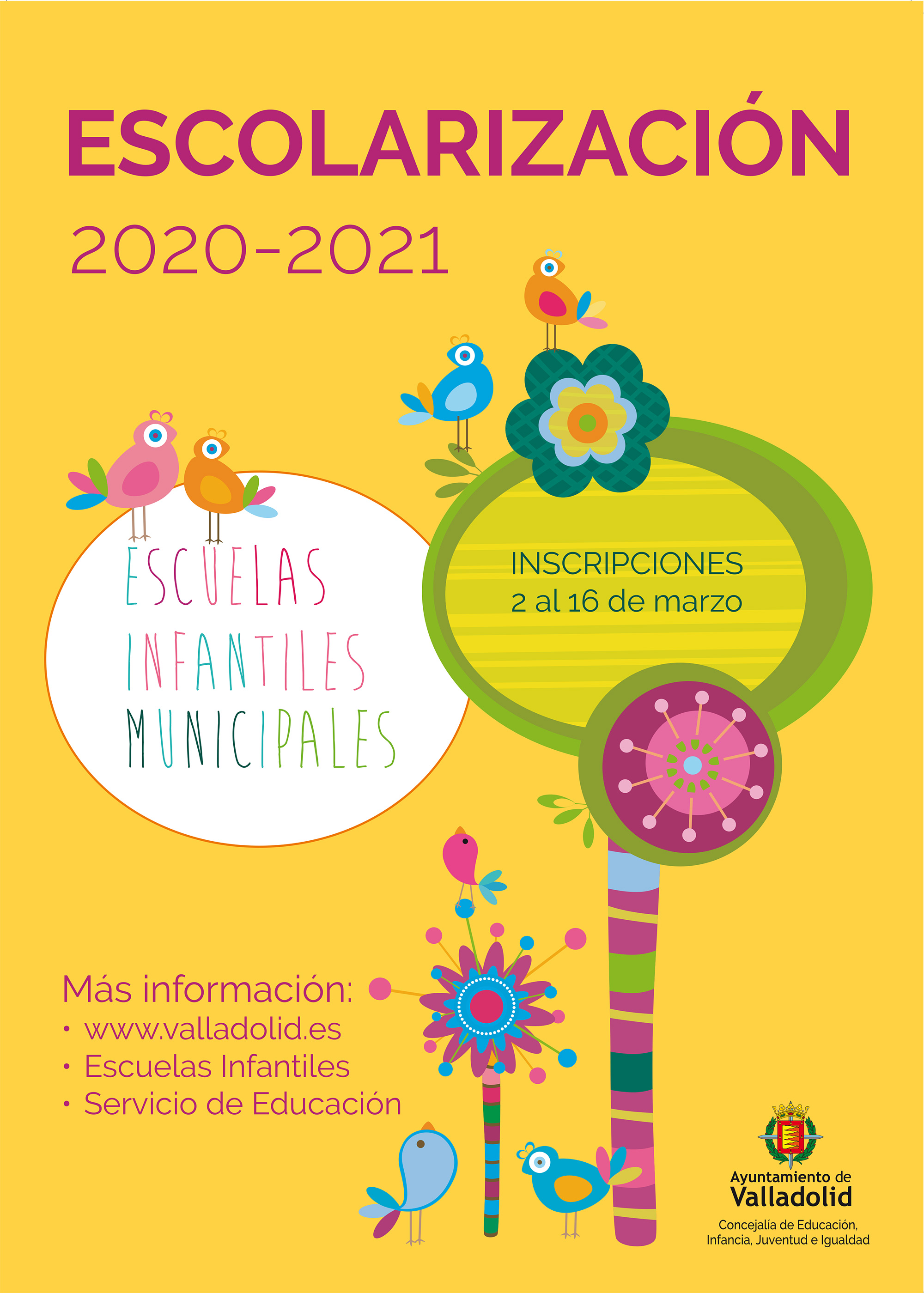 - Desde el 28 de febrero: recogida de solicitudes e información en: Escuelas infantiles, Servicio Municipal de Educación (Edificio San Benito, 2ª planta, puerta 49) y web municipal www.valladolid.esEste enlace se abrirá en una ventana nueva (escolarización escuelas infantiles).