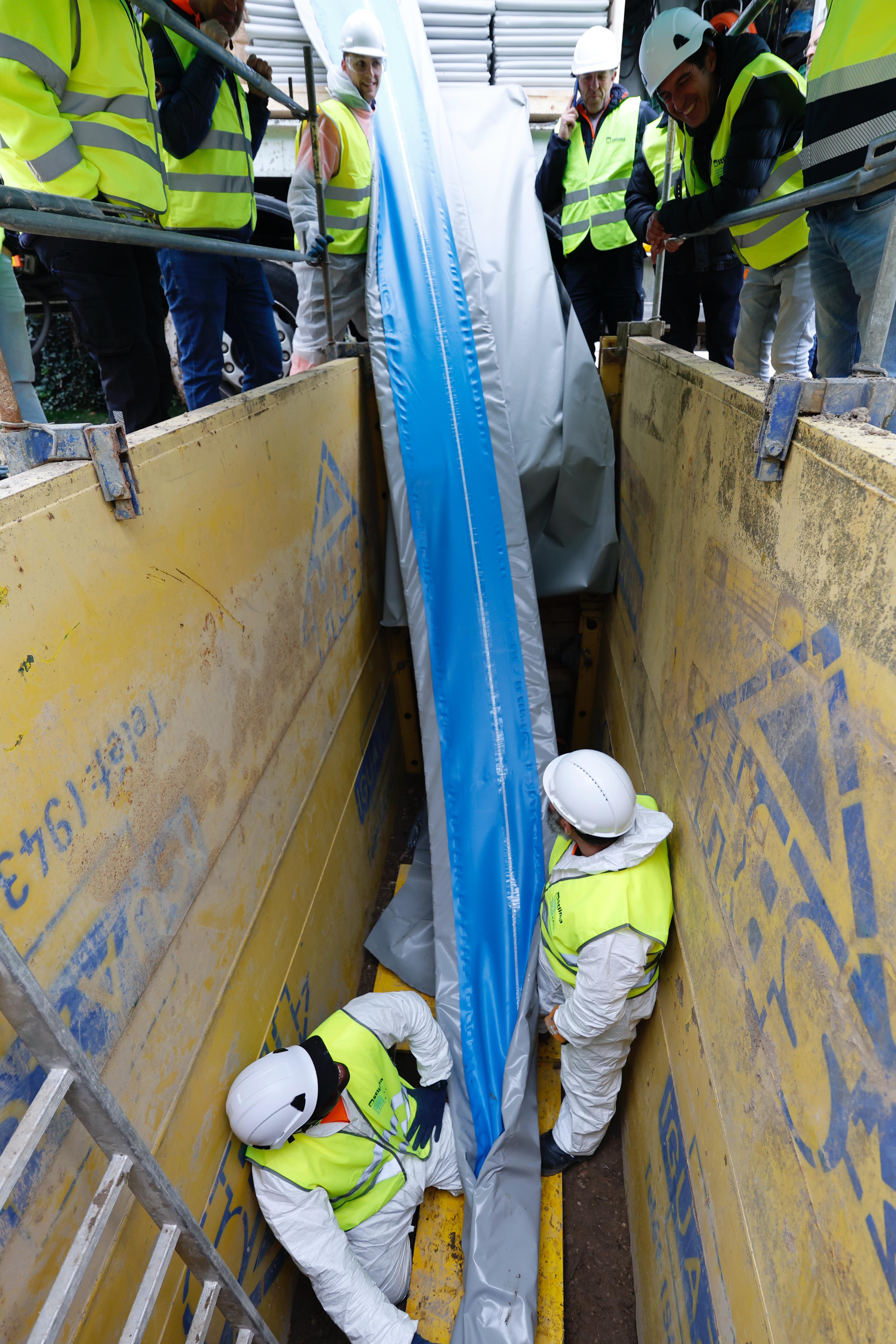 La tubería que se va a rehabilitar es de fibrocemento y tiene un diámetro de 400 milímetros. La manga a instalar será de fibra de vidrio, también de 400 milímetros, con un espesor de 4,3 milímetros. Puede soportar una presión interior de 18,2 Bar. La longitud del tramo es de unos 245 metros y para ello sólo ha sido necesario abrir unos pozos para el inicio y el final de la manga en los extremos del tramo a tratar.