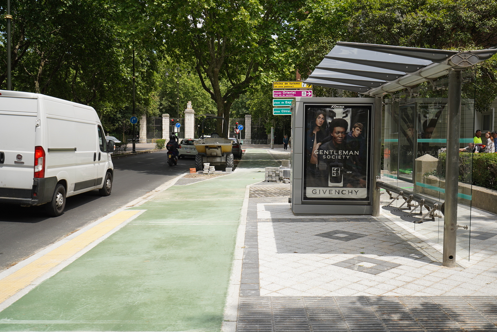 De forma simultánea se ha construido en paralelo a la acera y en su misma plataforma el nuevo carril bici, de 2,20 metros de anchura, en hormigón fratasado y coloreado en verde. En las intersecciones, y ya a cota de calzada, se ha conectado con los carriles bici de Hospital Militar y Filipinos, hasta completar un recorrido de aproximadamente 260 metros.
