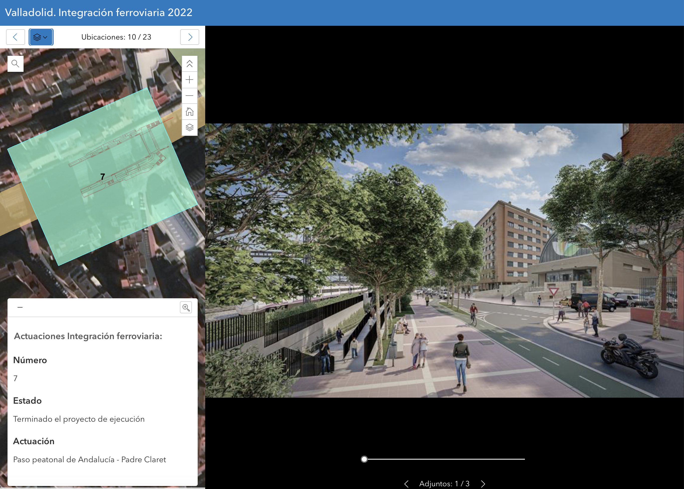 Tal como el concejal de Planeamiento Urbanístico y Vivienda, Manuel Saravia, informó el pasado lunes a la Federación Vecinal Antonio Machado, el Servicio de Cartografía ha realizado un visor para mostrar las diferentes actuaciones realizadas, proyectadas o en marcha, del Proyecto de Integración Ferroviaria en la ciudad. Puede accederse a información de los proyectos, a imágenes del estado actual y a infografías de los 30 pasos previstos a lo largo de la vía, que muestran el resultado previsto en los distintos puntos. Una información que se irá actualizando con nueva documentación. Se accede directamente desde la web en "Recomendamos", y también, como el resto de los visores gráficos interactivos de la ciudad, se encuentra en el PortalGIS.