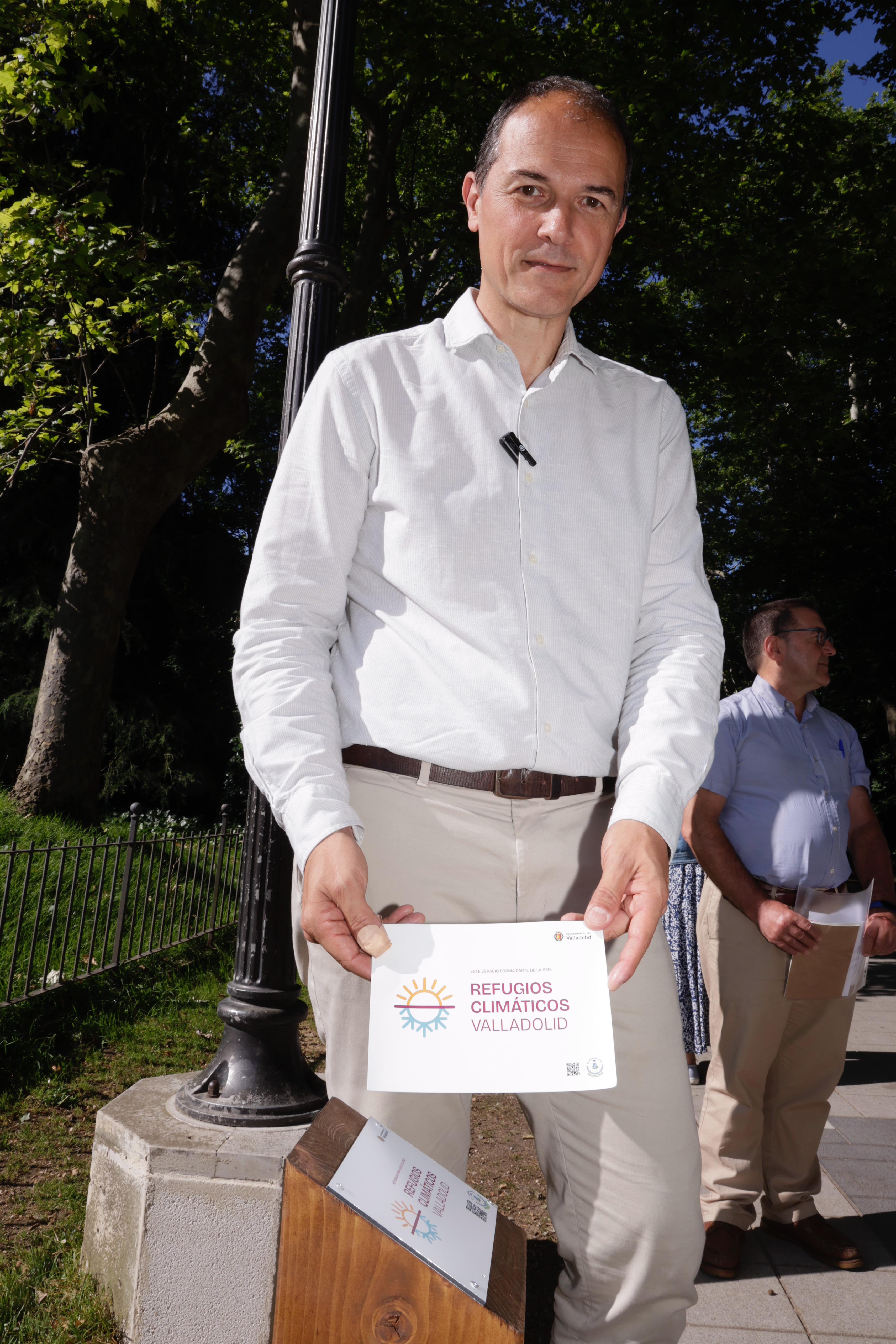 El concejal de Medio Ambiente, Alejandro García Pellitero, ha presentado hoy la nueva red de refugios climáticos, tanto interiores como exteriores, que pone en marcha el Ayuntamiento de Valladolid, como espacios idóneos que podrán ser utilizados por los vecinos, principalmente para hacer frente al fenómeno adverso de temperaturas altas extremas durante las olas de calor en verano, o también del frío en invierno. Esta red de refugios climáticos es una medida preventiva para reducir riesgos y mejorar la calidad de vida de toda la ciudadanía.