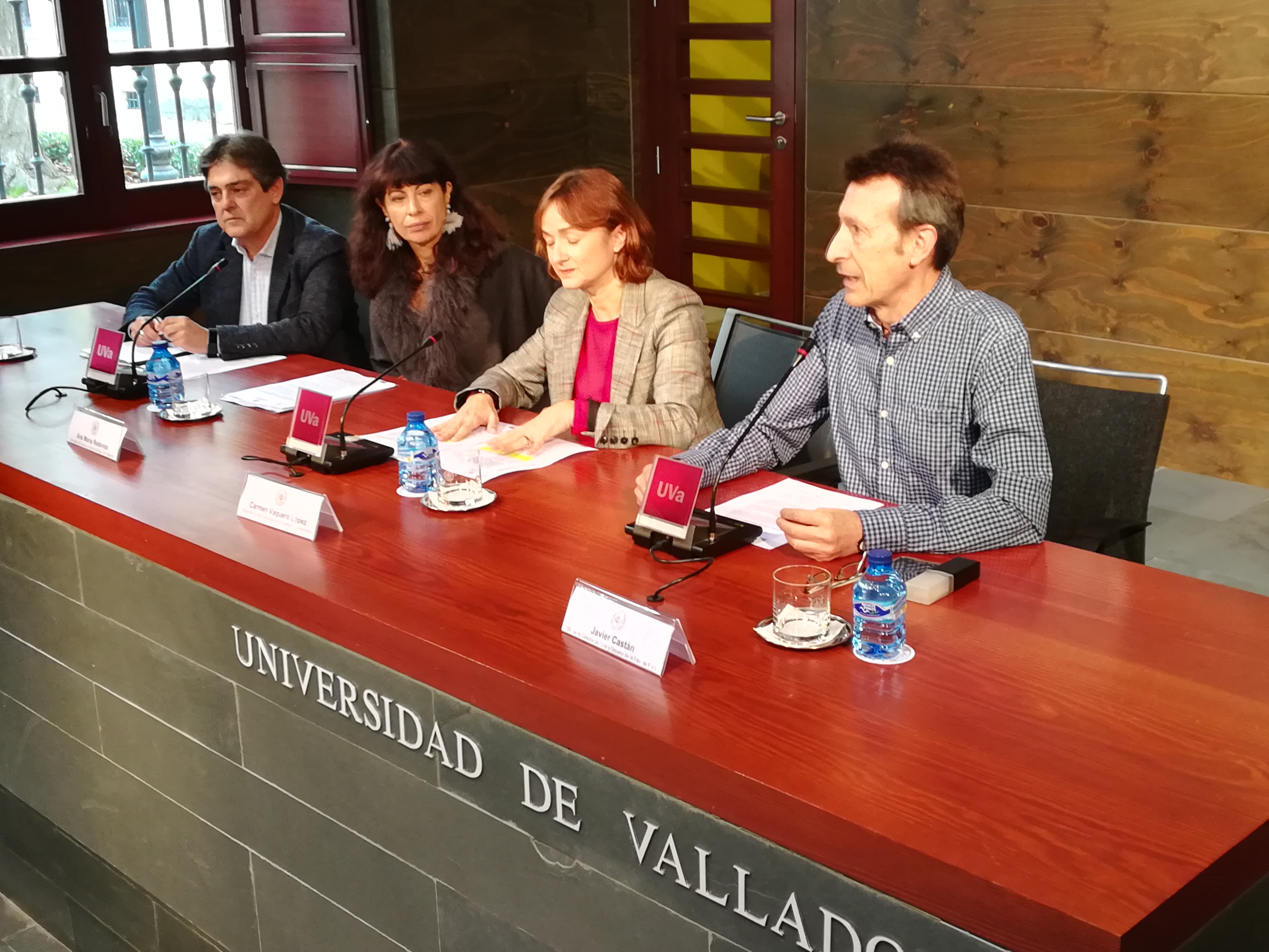 La Sala de Prnesa de la Universidad de Valladolid ha sido hoy el escenario en el que se ha presentado la nueva edición del ciclo "ESCENARIO Y PLATÓ", una iniciativa organizada por la UVa, a través de su Cátedra de Cine y la Facultad de Filosofía y Letras, junto con el Teatro Calderón y el Ayuntamiento de la capital. En la rueda de prensa han estado presentes la vicerrectora de Comunicación y Extensión Universitaria de la UVa, Carmen Vaquero; la concejala de Cultura y Turismo del Ayuntamiento de Valladolid, Ana María Redondo; el director de la Cátedra de Cine y decano de la Facultad de Filosofía y Letras, Javier Castán, y el director del Teatro Calderón, José María Viteri.