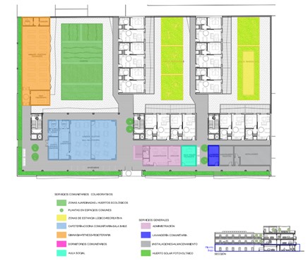 Se trata de una iniciativa a desarrollar en régimen de cooperativa, en la que coexisten pequeños estudios de uso privado, con una gran superficie de espacios de uso común, tanto cubierta como exterior, que favorezca y permita la relación, participación y colaboración entre los integrantes de esta comunidad. Las zonas comunes están pensadas para el disfrute de los residentes y para tratar de que ayuden a las relaciones sociales y al ocio.