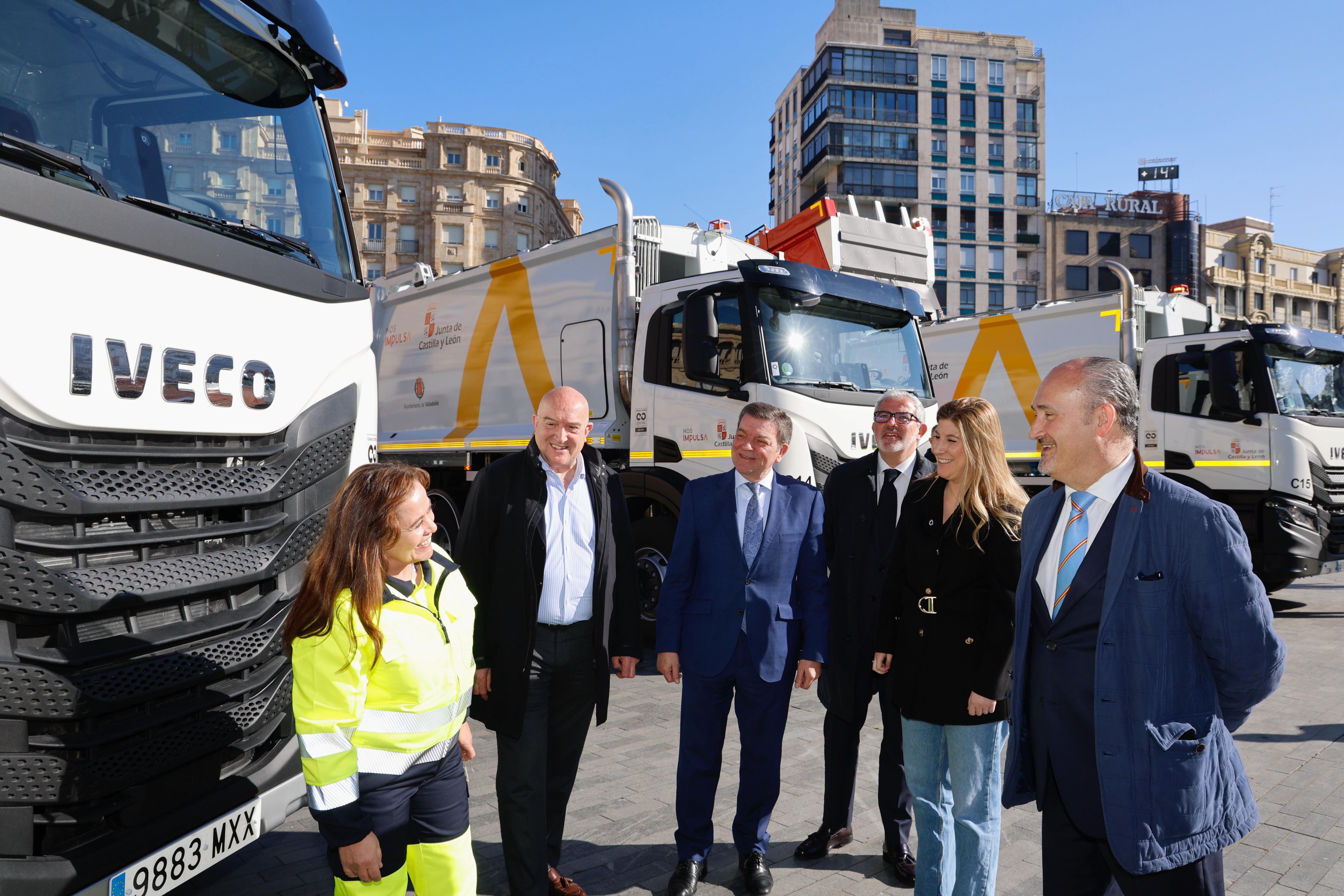El alcalde de Valladolid, Jesús Julio Carnero, y el consejero de la presidencia de la Junta de Castilla y León, Luis Miguel González Gago, han presentado los 4 nuevos camiones recolectores de carga trasera que se incorporarán al Servicio Municipal de Limpieza, tras una inversión de 1.071.256 euros. Se trata de camiones de 26 toneladas de Masa Máxima Autorizada (MMA), con motores de Gas Natural Comprimido (GNC) y caja de cambios automática.