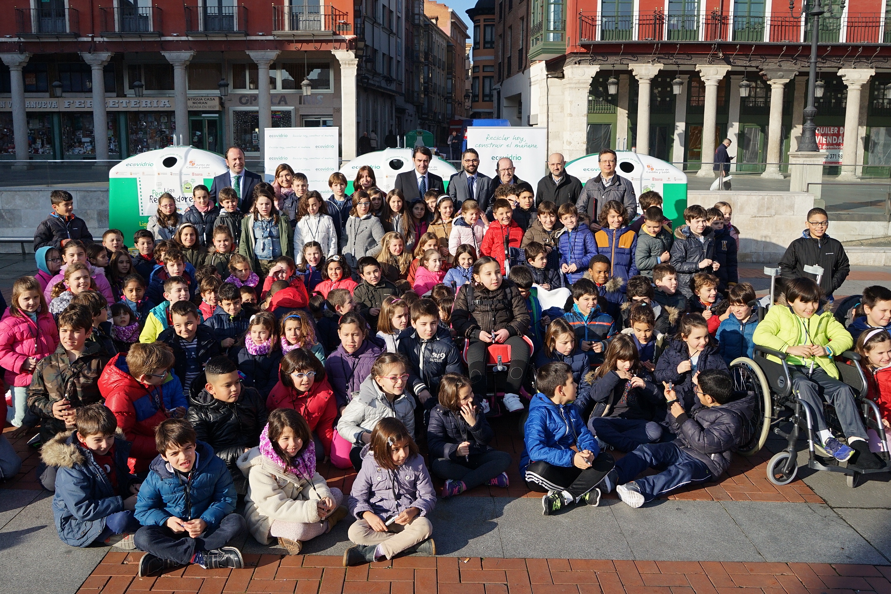 Las concejalas de Medio Ambiente y Sostenibilidad, María Sánchez, y Educación, Infancia e Igualdad, Victoria Soto, presentaron la campaña junto al consejero de Fomento de la Junta, Juan Carlos Suárez Quiñones, y los responsables de Ecovidrio en la Plaza Mayor.