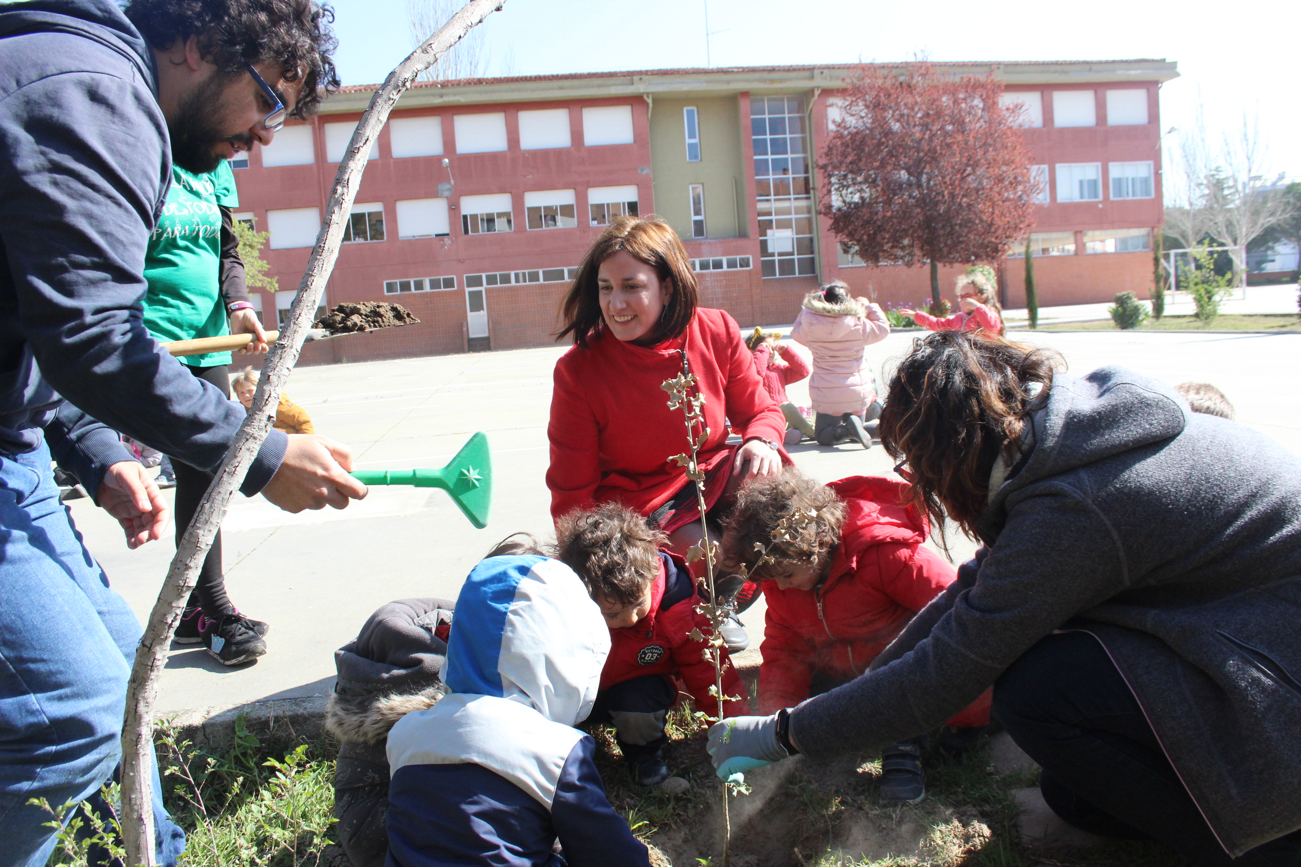 Durante la visita de María Sánchez al Colegio Antonio Machado ha podido hablar con los padres y madres del AMPA que gestionan el Huerto y ha ayudado a los peques del colegio a la plantación de un árbol al que han decidido llamarle 'Solete'.
