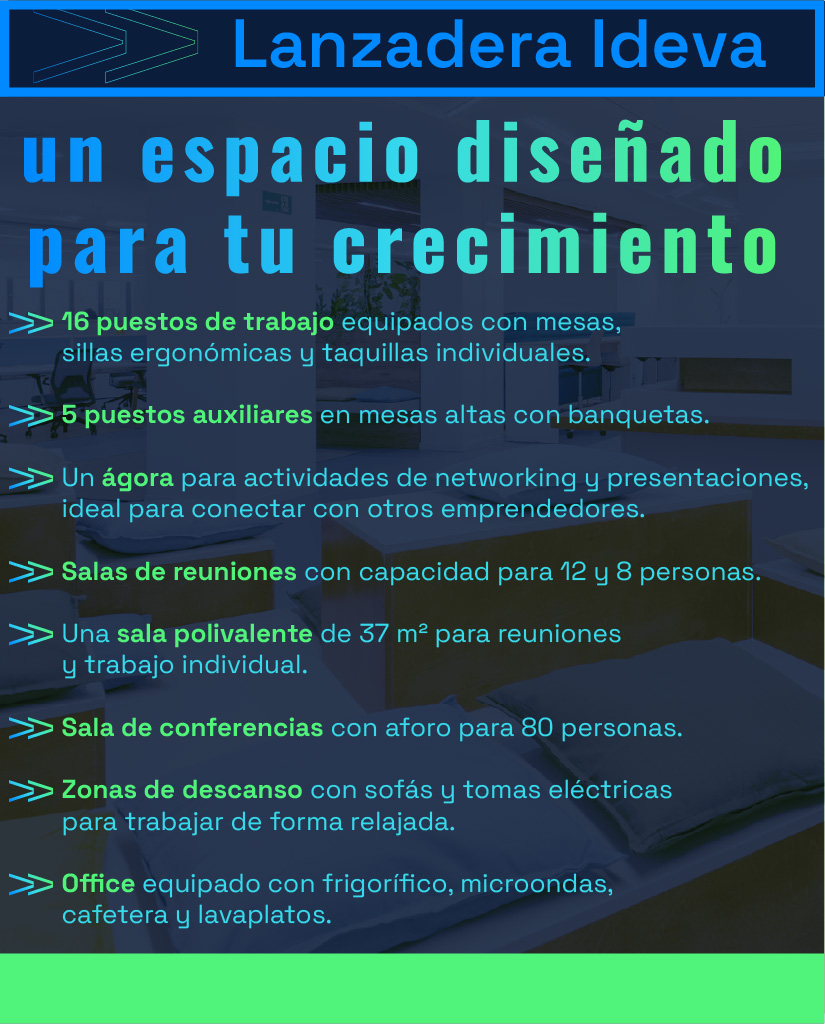 · Alberga equipamiento para 16 puestos de trabajo y acceso a servicios de salas de trabajo, zonas de descanso y espacios de ‘networking’.