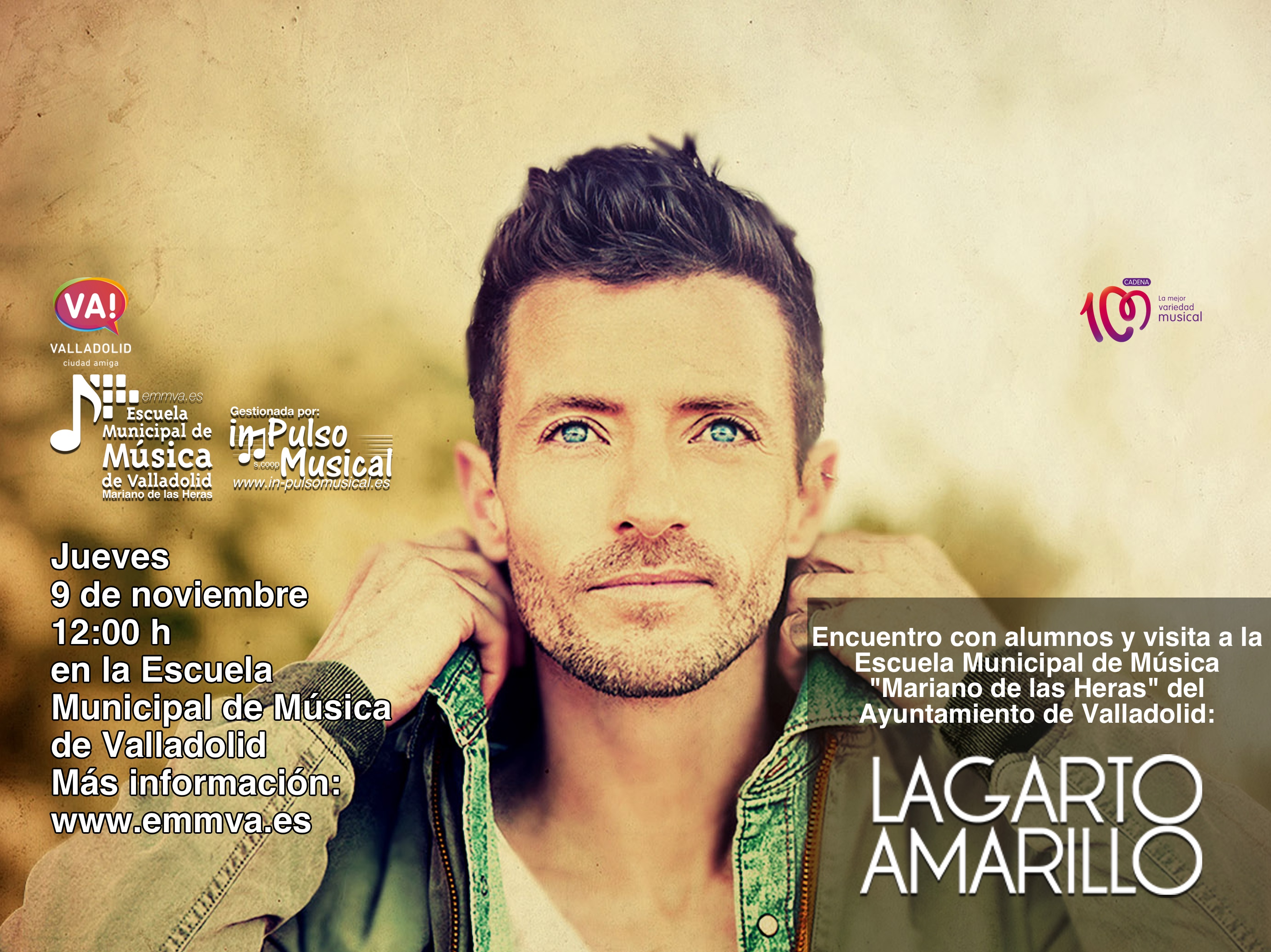 La Escuela Municipal de Música "Mariano de las Heras", del Ayuntamiento de Valladolid, recibirá el jueves 9 de noviembre, a las 12 del mediodía, la visita de Pablo Mora, vocalista y compositor de Lagarto Amarillo con motivo de su participación esa misma tarde en el Club 100 que se celebrará en la sala Porta Caeli de Valladolid.