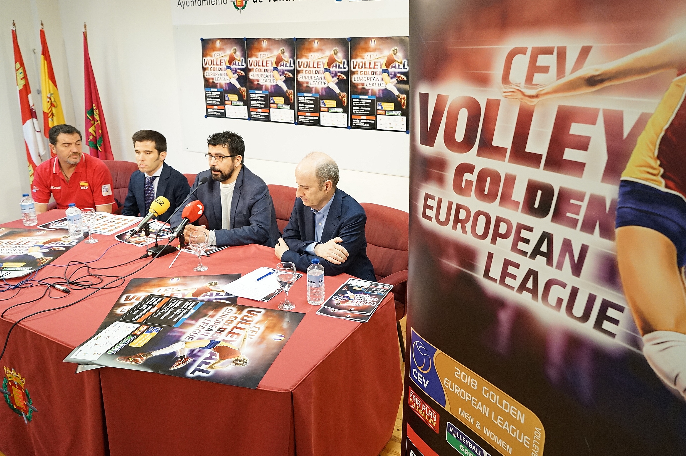 El concejal de Deportes, Alberto Bustos, ha presentado esta mañana, junto al presidente de la Real Federación de Voleibol Española, Agustín Martín Santos, y el director de Deportes de la Junta de Castilla y León, Alfonso Lahuerta, los partidos que se van a celebrar en el Poliderportivo Huerta del Rey con motivo de la Golden European League.