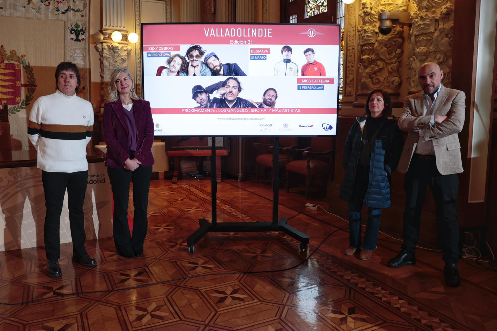 La concejala de Educación y Cultura, Irene Carvajal, ha presentado hoy en Salón de Recepciones de la Casa Consistorial la 31ª edición de Valladolindie acompañada por Roberto Terne, organizador del ciclo musical; María José Pozo, técnico de actividades culturales del Centro Buendía de la Universidad de Valladolid y Antonio Ruiz, gerente de Palausa Centro.