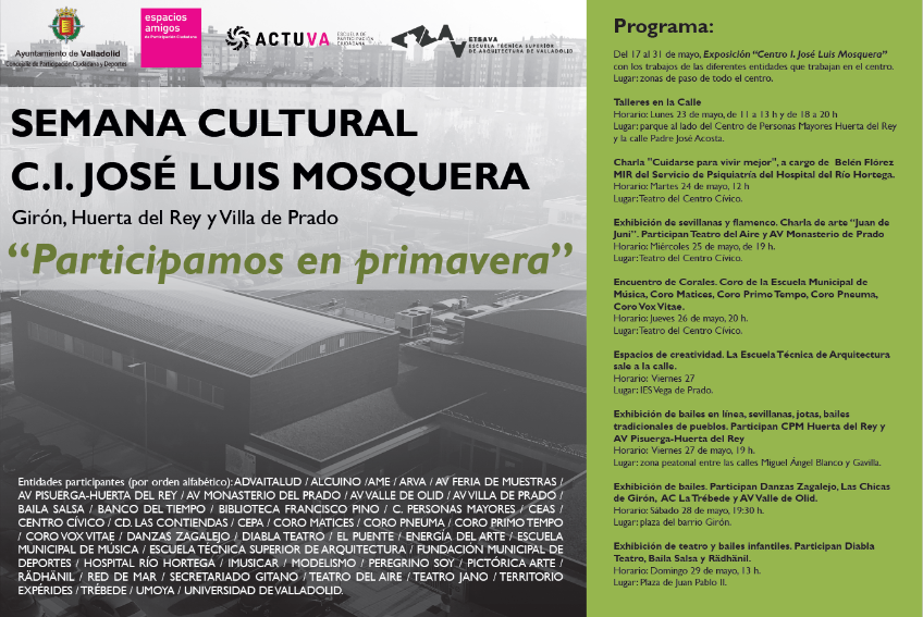 This link will open in a pop-up window.Durante la semana del 20 al 26 de junio habrá distintas actividades como visitas guiadas, actuaciones de teatro, verbena ... Todas estas actividades serán dirigidas por distintas asociaciones del barrio de San Juan, Circular y Vadillos,