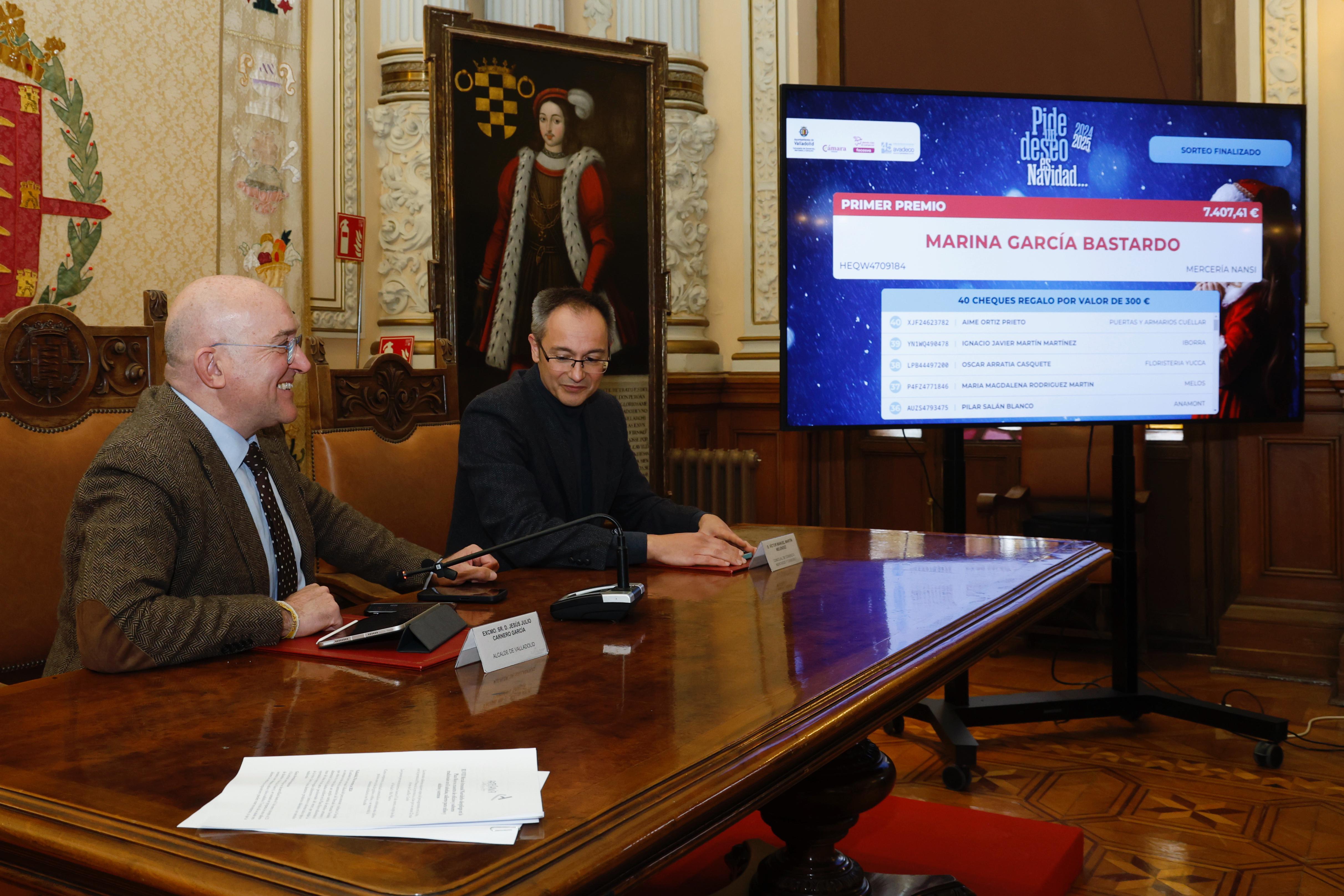 El alcalde, Jesús Julio Carnero, ha presidido en el Salón de Recepciones del Ayuntamiento el tradicional sorteo de ‘El Árbol de los Deseos’, que ha alcanzado su vigésimo primera edición y que por cuarto año consecutivo se ha llevado a cabo de manera telemática. Una vez celebrado el mismo ha contactado en directo con Marina García Bastardo, quien realizó su compra en Mercería Nansi para comunicarle que había resultado ganadora del cheque regalo de 6.000 euros correspondiente a esta campaña.