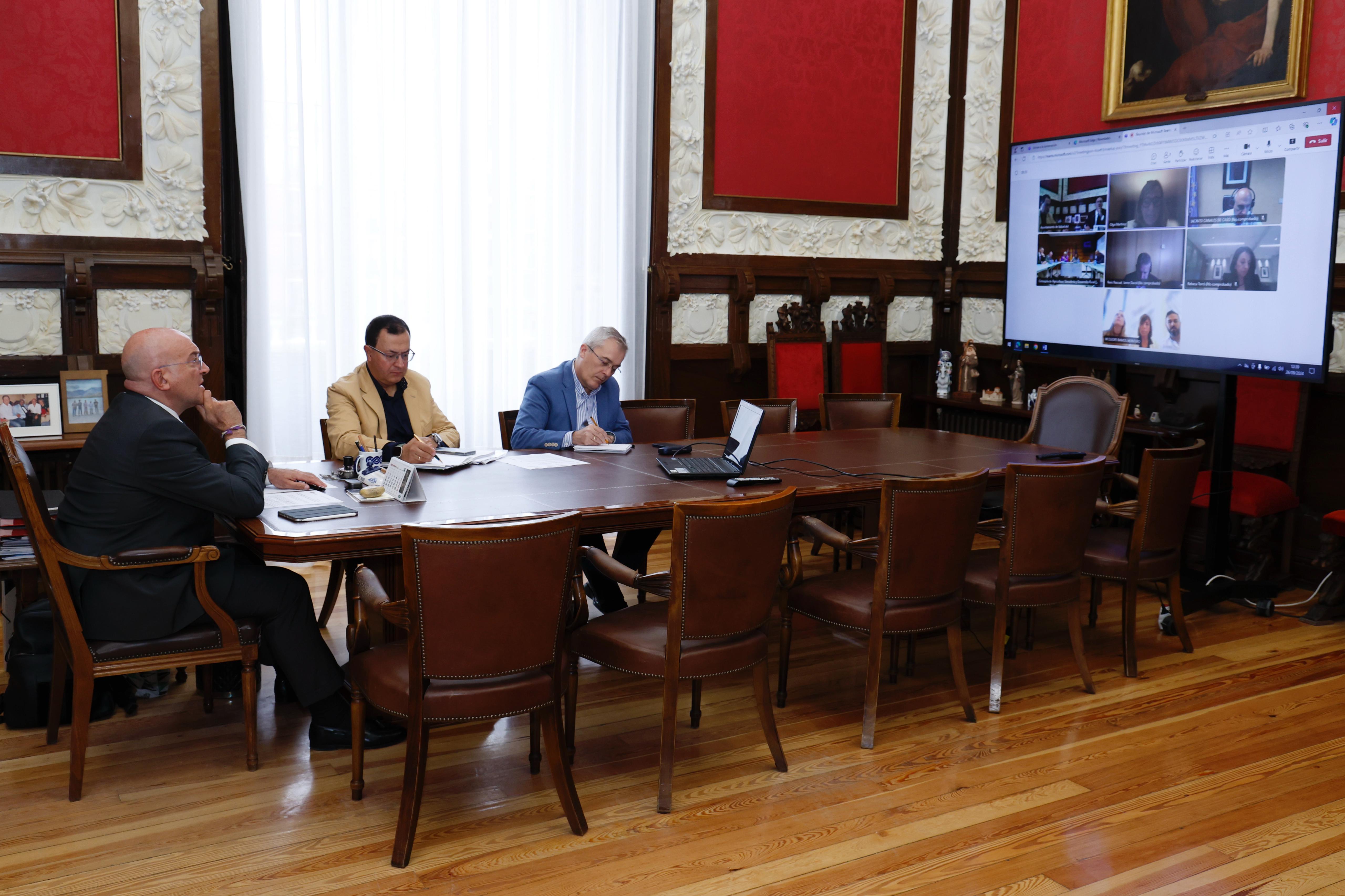 El alcalde de Valladolid, Jesús Julio Carnero, ha participado hoy en la reunión telemática que ha mantenido junto a representantes de Bimbo España (en este caso la directora y subdirectora de Recursos Humanos, Cleofe Ramos y Gloria Carrasco, respectivamente, y la directora de Relaciones Institucionales, Olga Martínez), la secretaria de Estado de Industria, Rebeca Torró; el subdelegado del Gobierno en Valladolid, Jacinto Canales; y los consejeros de la Junta de Castilla y León (Leticia García, de Industria, Comercio y empleo; y María González, de Agricultura, Ganadería y Desarrollo Rural).