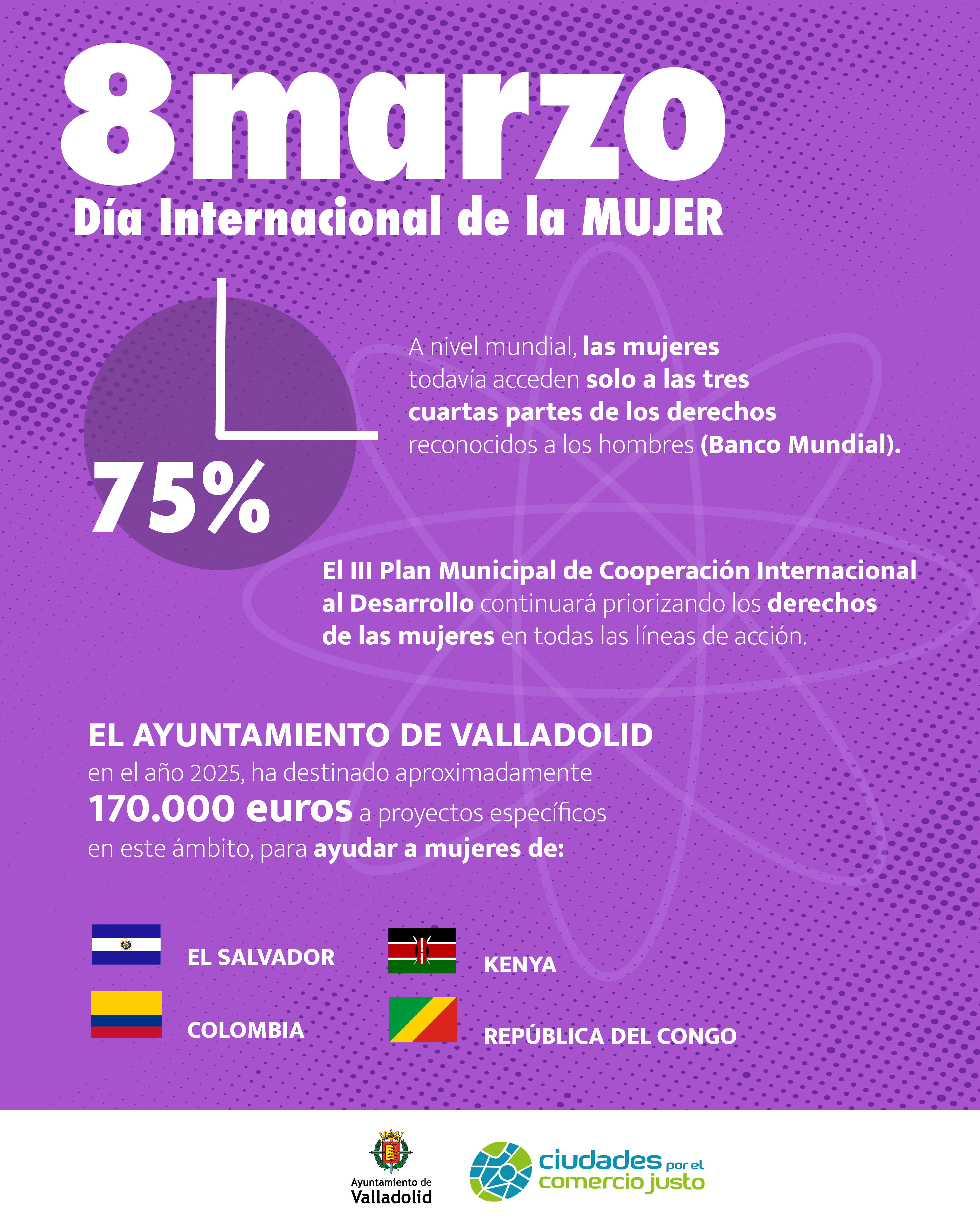 Con motivo del 8 de marzo, Día Internacional de la Mujer, el Ayuntamiento de Valladolid reafirma su compromiso con la igualdad de oportunidades entre hombres y mujeres, y la defensa de los derechos de las mujeres en todo el mundo.