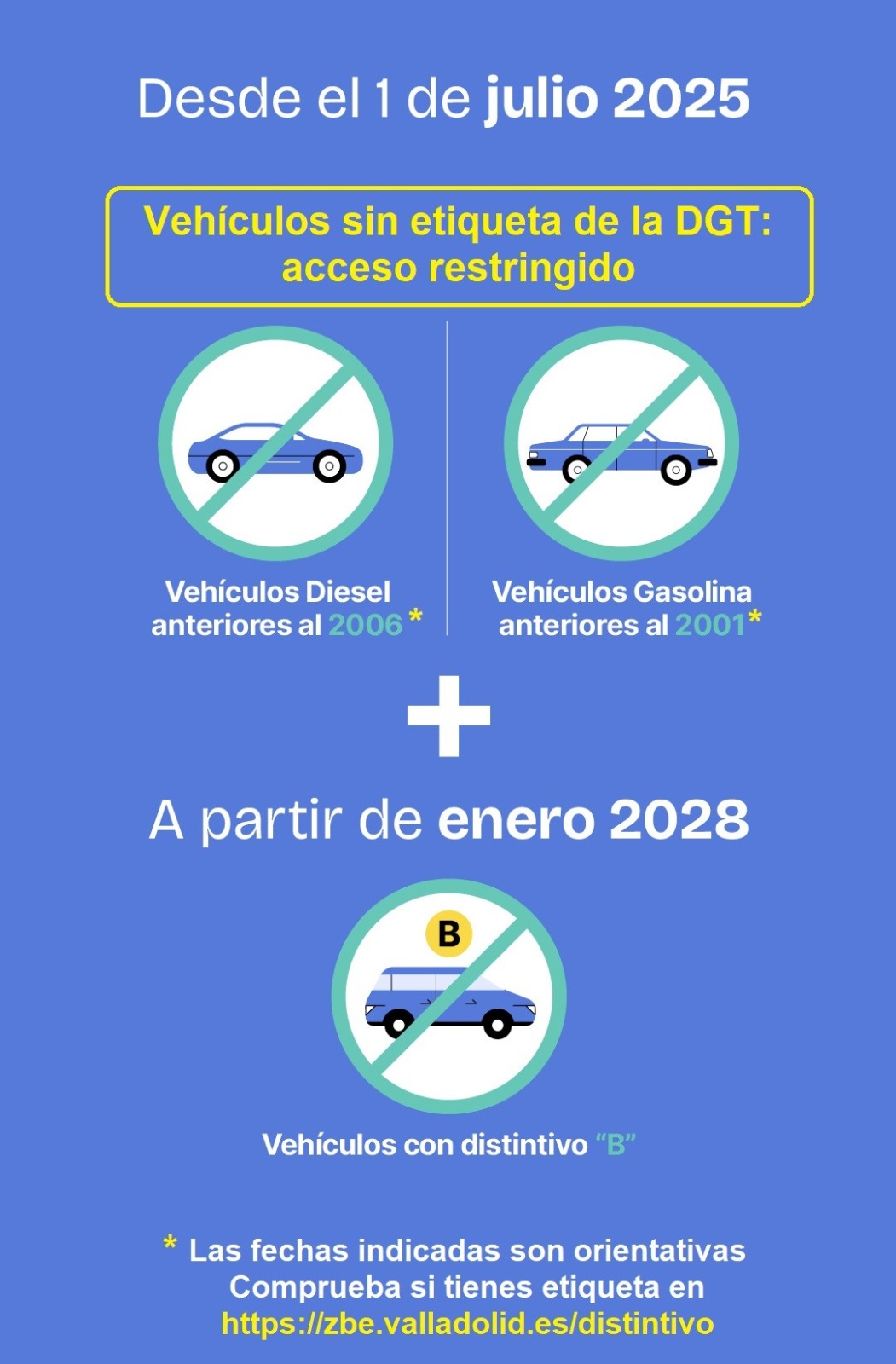 Los vehículos sin etiqueta de la DGT que orientativamente son los diésel anteriores a 2006 y los gasolina anteriores a 2001. Comprueba la etiqueta de tu vehículo en https://zbe.valladolid.es/distintivoEste enlace se abrirá en una ventana nueva.
