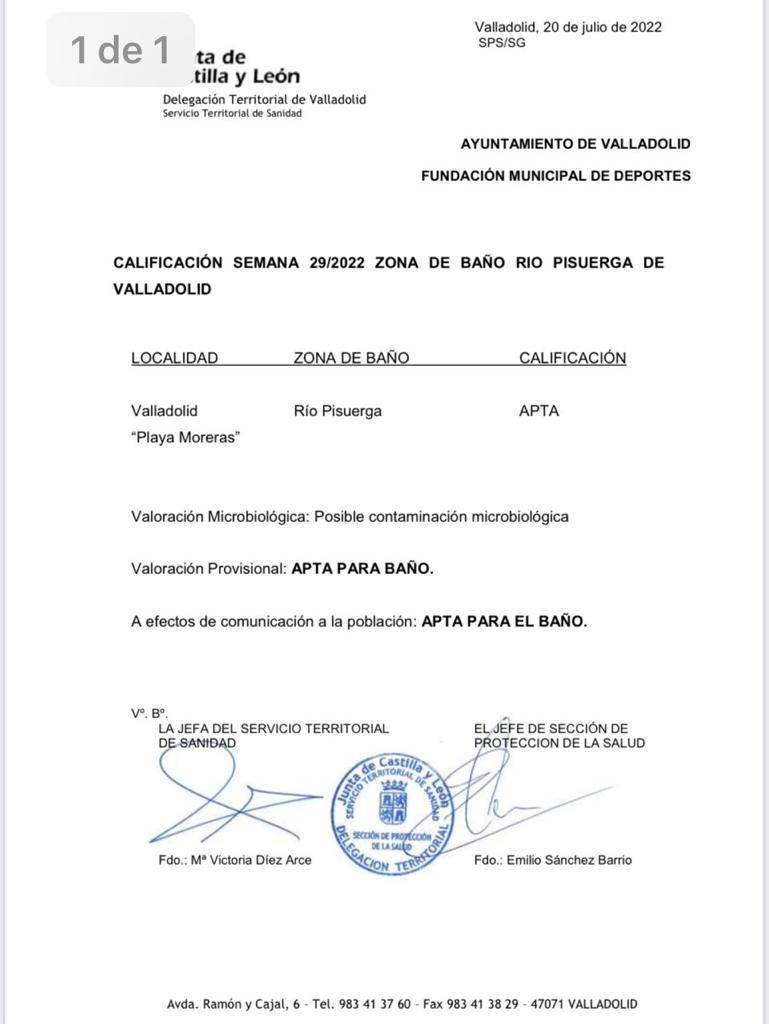 Hoy, el Servicio Territorial de Sanidad de la Junta de Castilla y León ha remitido al Ayuntamiento un nuevo informe en el que se indica que el agua de la Playa de las Moreras vuelve a ser apta para el baño.