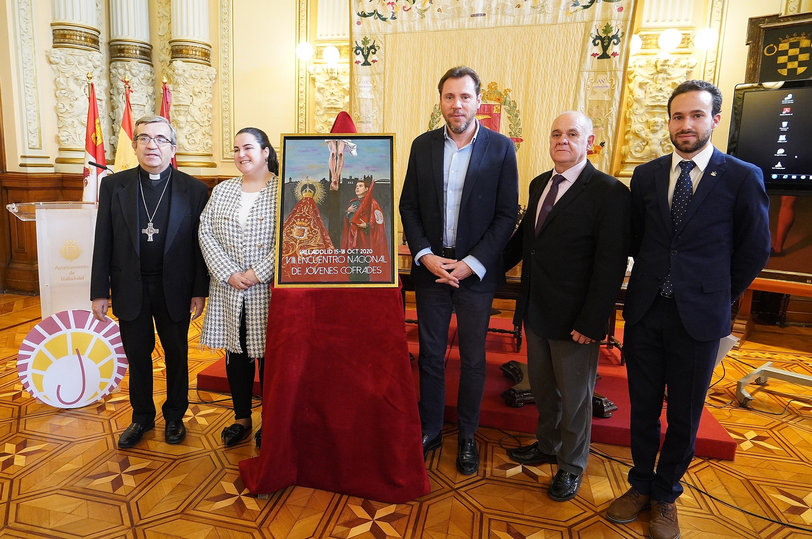 El alcalde, Óscar Puente, ha presidido la presentación del VIII Encuentro Nacional de Jóvenes de Hermandades y Cofradías que ha tenido lugar en el salón de recepciones en la mañana de hoy junto con el Obispo Auxiliar de Valladolid, Luis Argüello, el presidente de la Junta de Cofradías de Valladolid, Isaías Martínez, y el director del Encuentro, Javier Alonso.