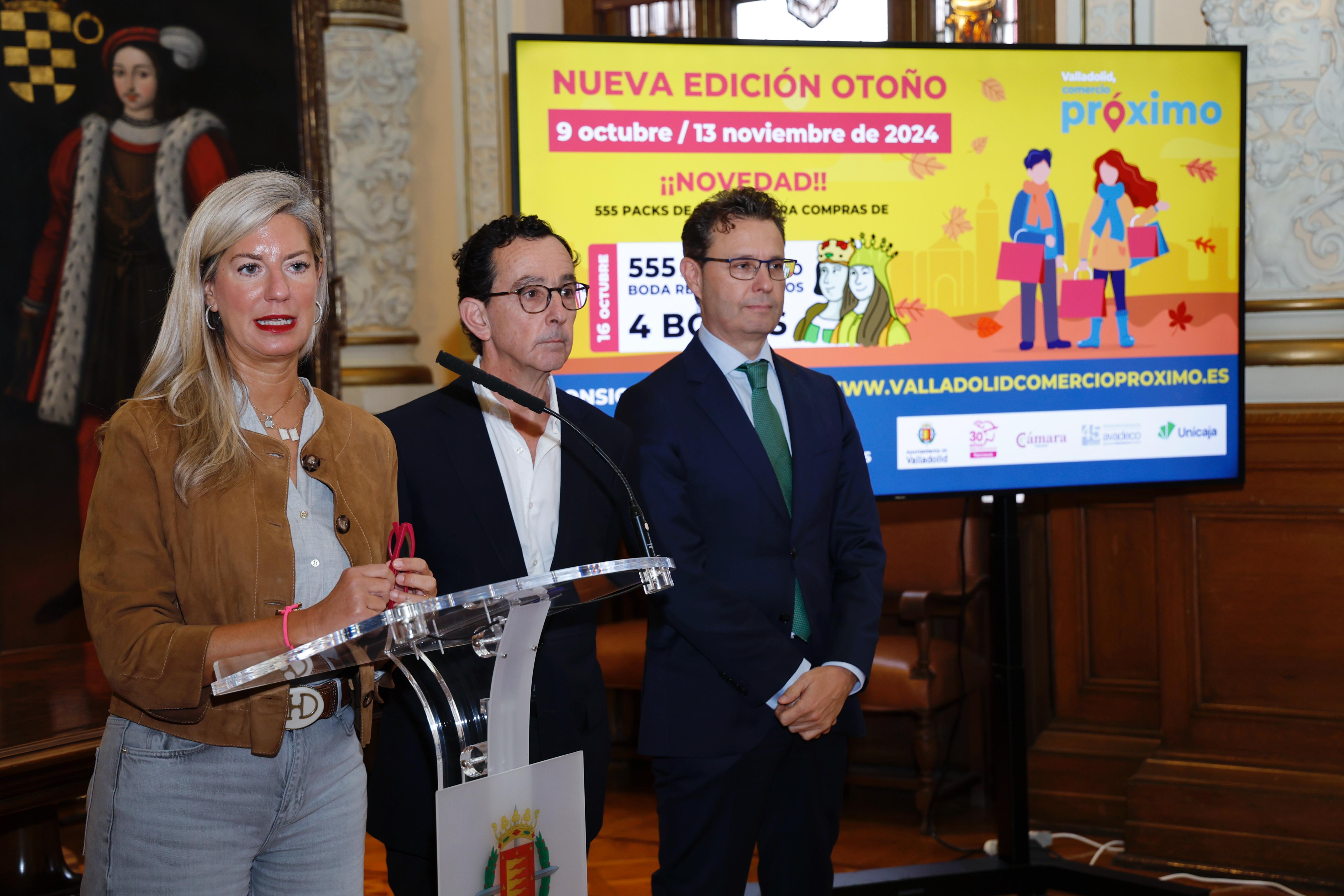 La concejala de Educación y Cultura, Irene Carvajal; el presidente de AVADECO, Rafael Monedero; el presidente de FECOSVA, Jesús Herreras; el tesorero de la Cámara de Comercio de Valladolid, Jorge Valentín-Gamazo; y el director de la Zona Valladolid Centro de Unicaja, José Manuel Matilla, han presentado en la mañana de hoy la campaña ‘Tu Bono Próximo – Otoño’ que se desarrollará desde mañana, 9 de octubre, hasta el 13 de noviembre, con el objetivo de apoyar y revitalizar las ventas en el pequeño comercio de la ciudad.