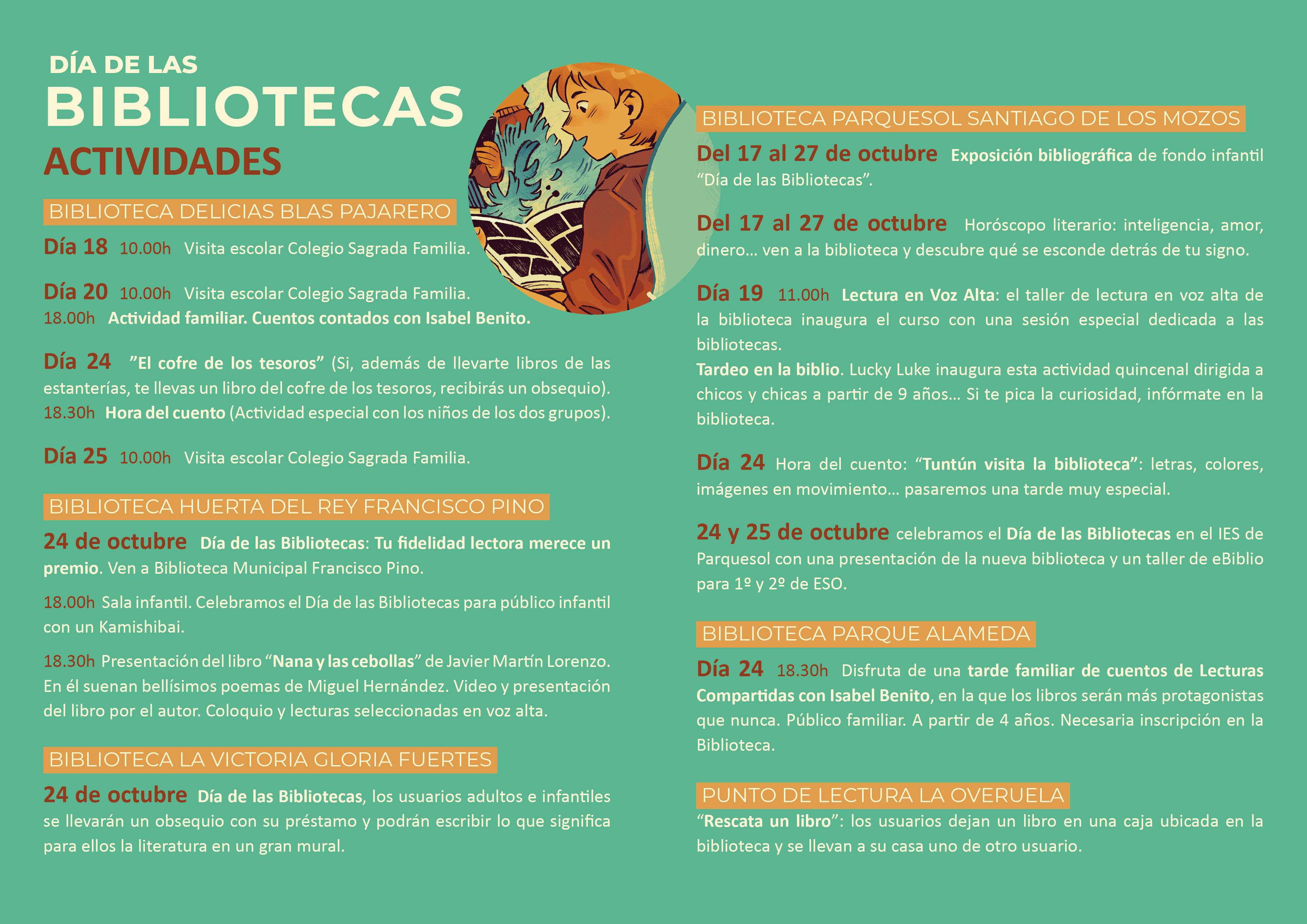 • 24 de octubre Día de las Bibliotecas, los usuarios adultos e infantiles se llevarán un obsequio con su préstamo y podrán escribir lo que significa para ellos la literatura en un gran mural.