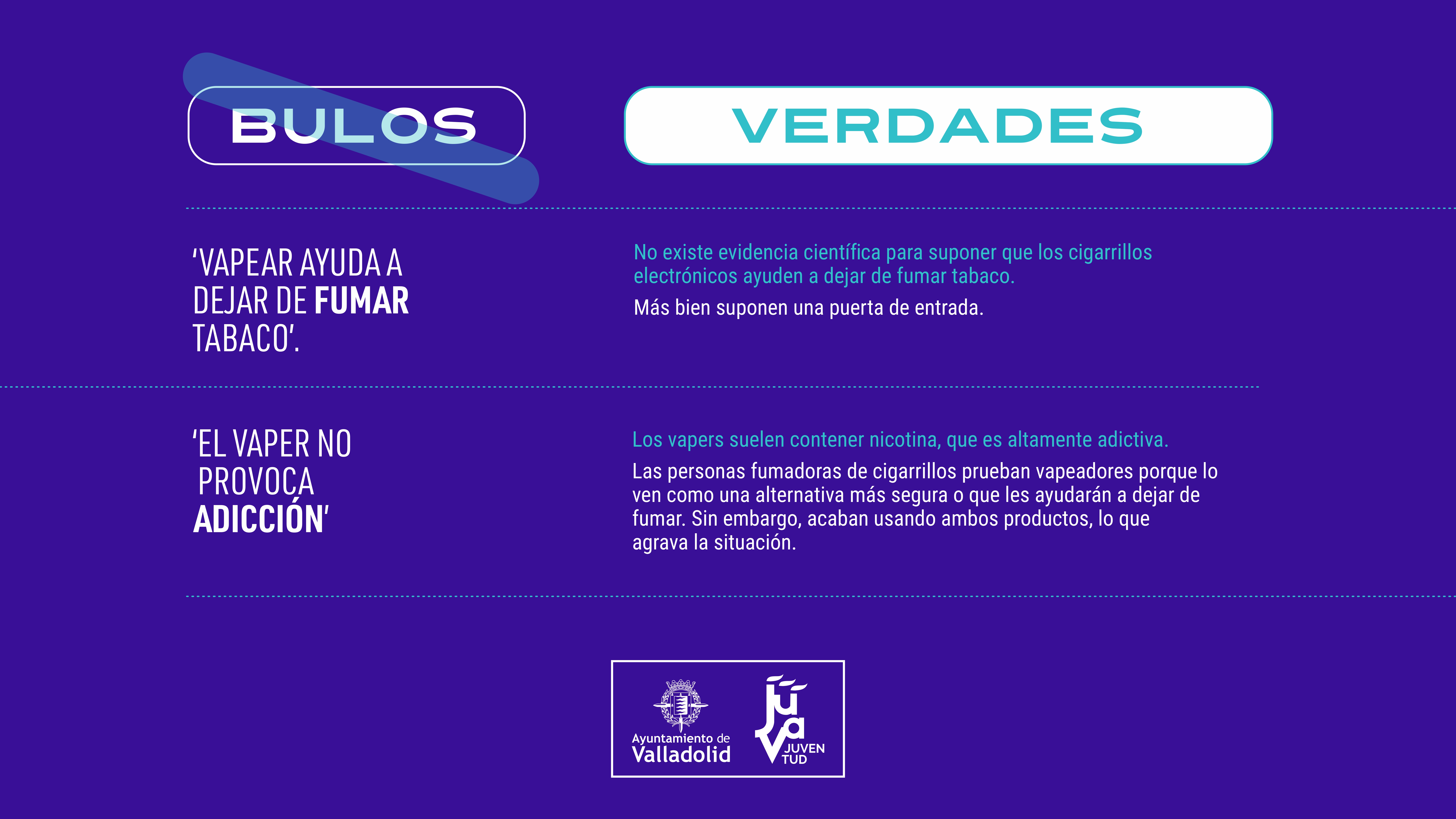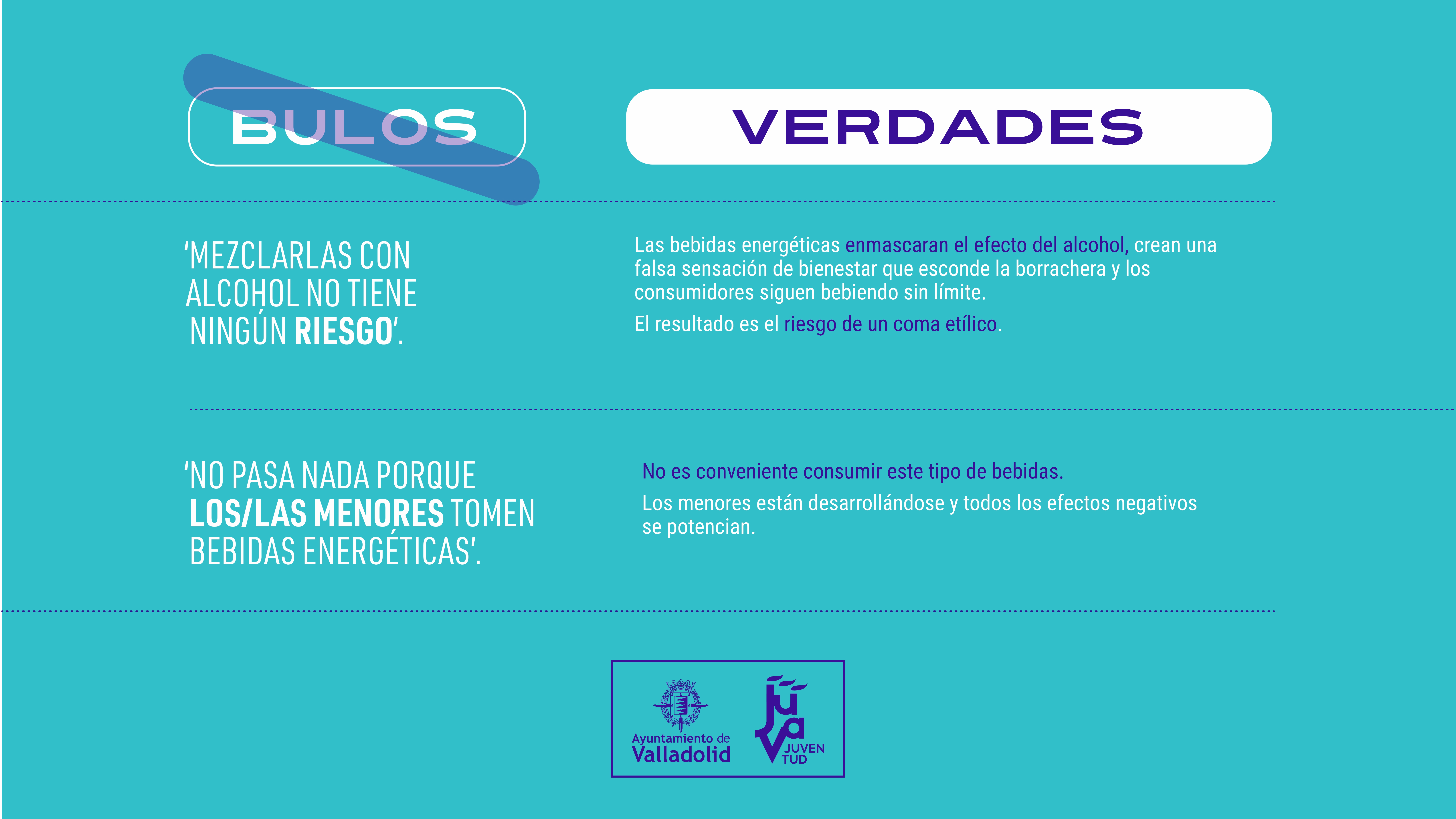 - Campaña de sensibilización sobre bebidas energéticas y vapeadores. Se han elaborado infografías que desmienten bulos y presentan información veraz, distribuyéndose en centros educativos de ESO, Bachillerato y Ciclos Formativos, así como en bibliotecas, CEAS, centros cívicos, polideportivos de la Fundación Municipal de Deportes y los Espacios Jóvenes de la ciudad.