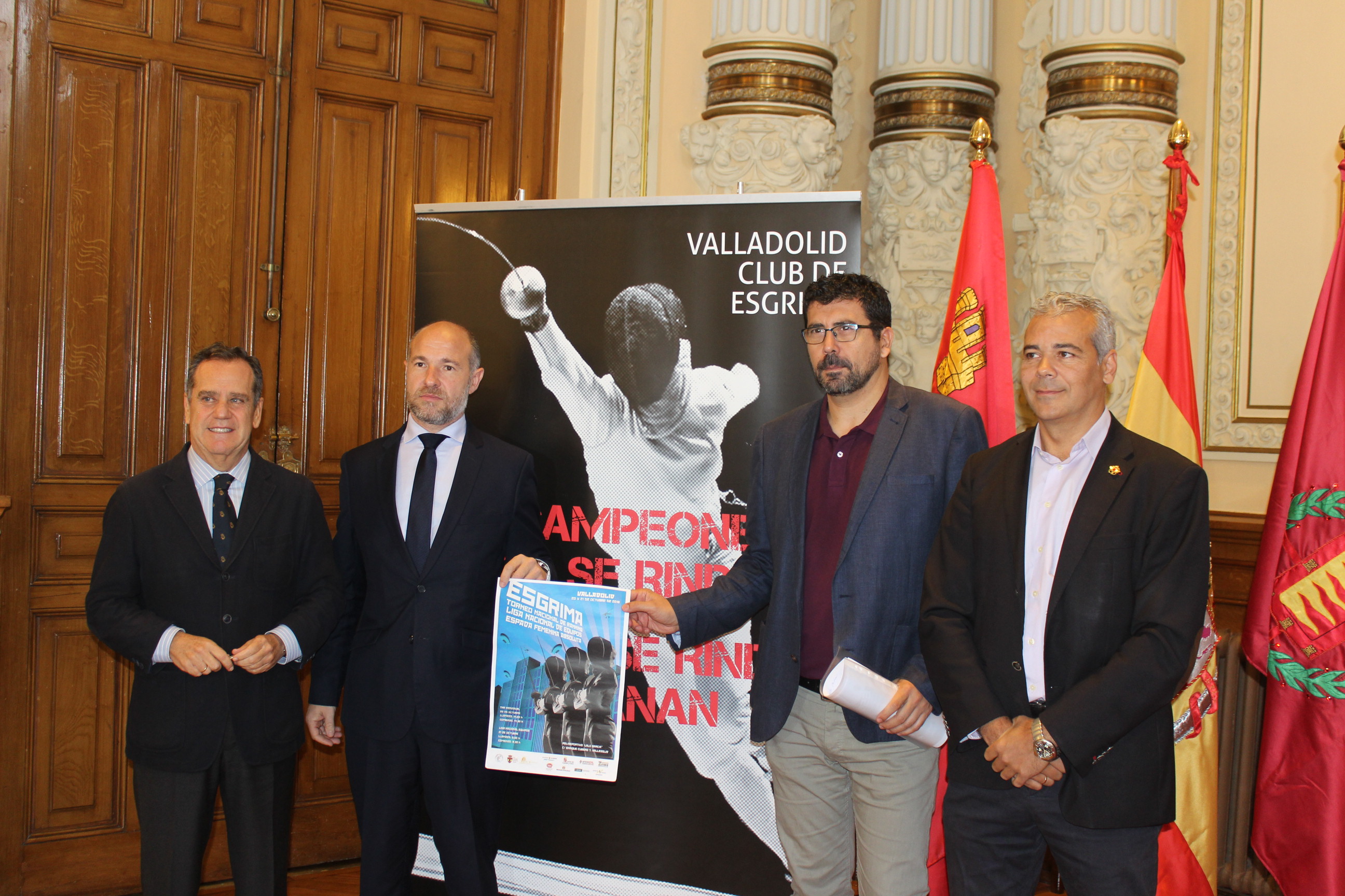 El concejal de Deportes, Alberto Bustos, acompañado del presidente de Esgrima de Castilla y León, Daniel Bravo, y del presidente del Valladolid Club de Esgrima, Julio Mozo, ha presentado esta mañana en el Ayuntamiento el "Torneo Nacional de Ranking de Espada Absoluta Femenina" que se celebrará en el Complejo Deportivo "Lalo García".