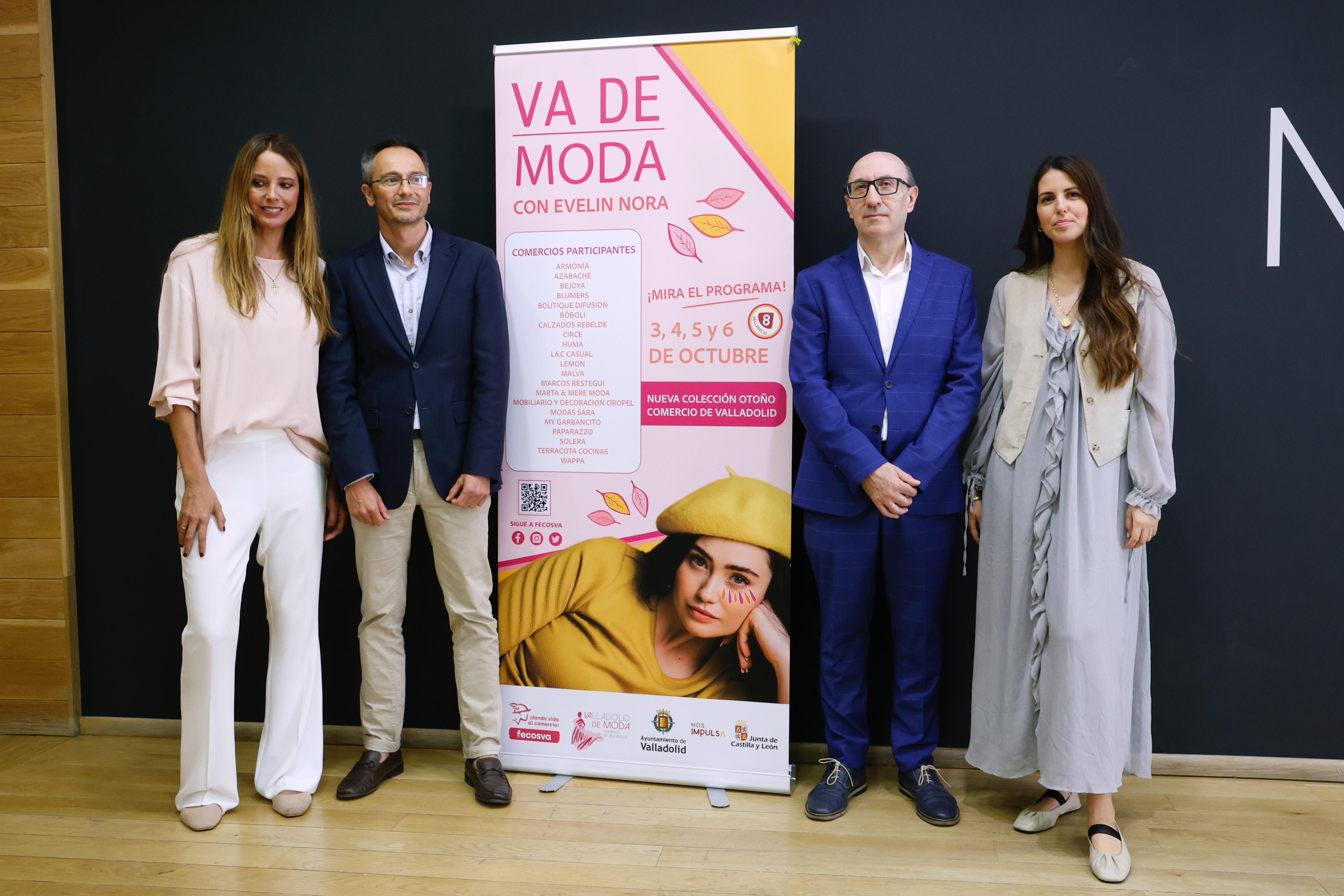 El concejal de Comercio, Mercados y Consumo, Víctor Martín; el presidente de la Federación de Comercio y Servicios de Valladolid (FECOSVA), Jesús Herreras; la creadora de contenido Evelin Nora, y la directora de pasarelas Estefanía Luyk han presentado esta mañana en el Museo Patio Herreriano la campaña VA DE MODA-Tendencias de Otoño. Una acción promocional organizada por FECOSVA, con la colaboración del Ayuntamiento de Valladolid y el patrocinio de la Junta de Castilla y León.