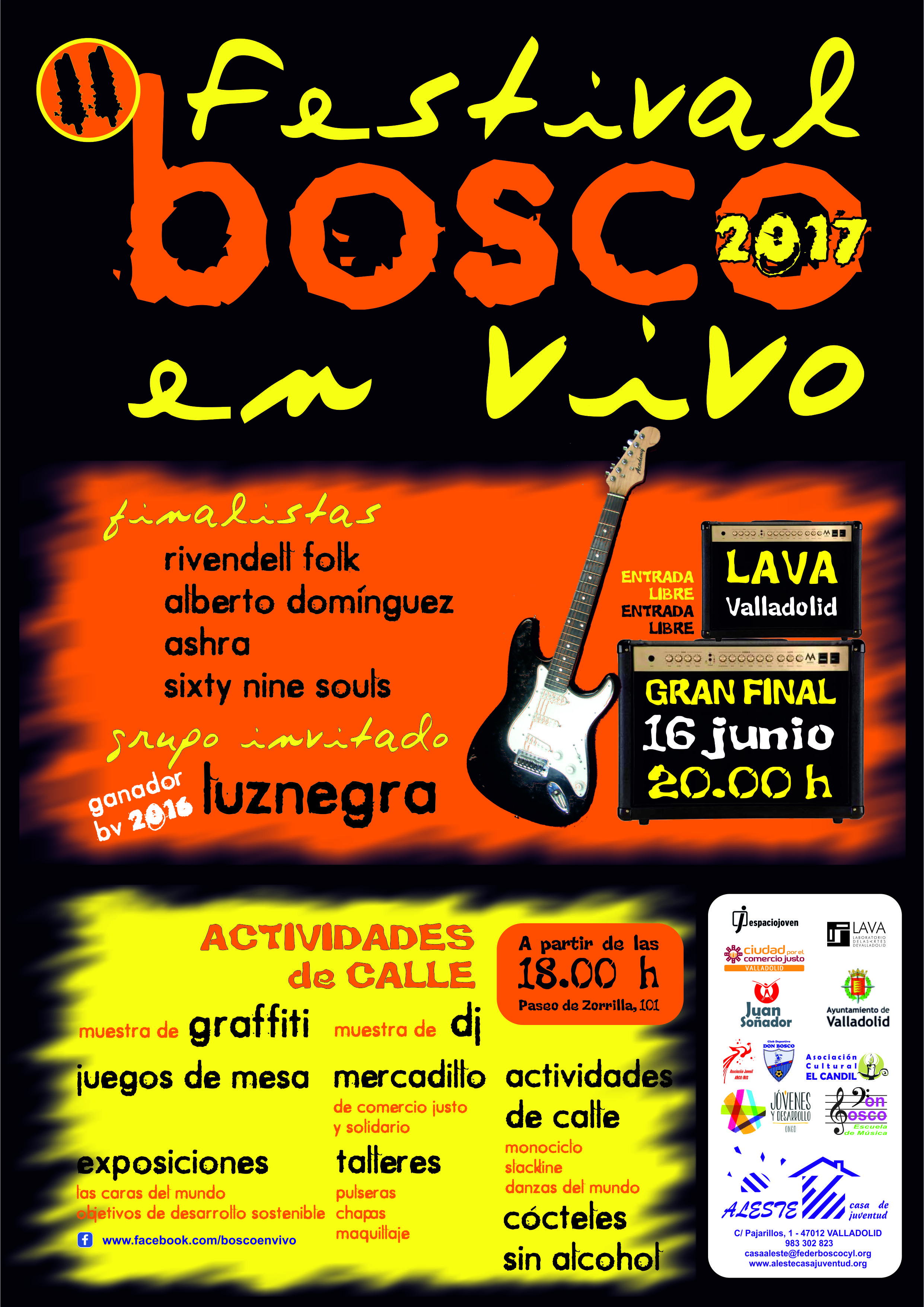 El 16 de junio, a las 20 horas, en la Sala Blanca del LAVA se darán cita los cuatro finalistas de la segunda edición del Festival Bosco en Vivo: Rivendell Folk, Alberto Domínguez, Ashra y Cheroot. En esta edición han participado diez grupos de música y solistas de Valladolid y provincia, a lo largo de varias semanas han actuado en directo en las instalaciones de la Casa de Juventud Aleste, en formato de "café-concierto", de acceso gratuito, donde se ha podido disfrutar de buena música, en un contexto de carácter solidario y degustando productos de Comercio Justo.