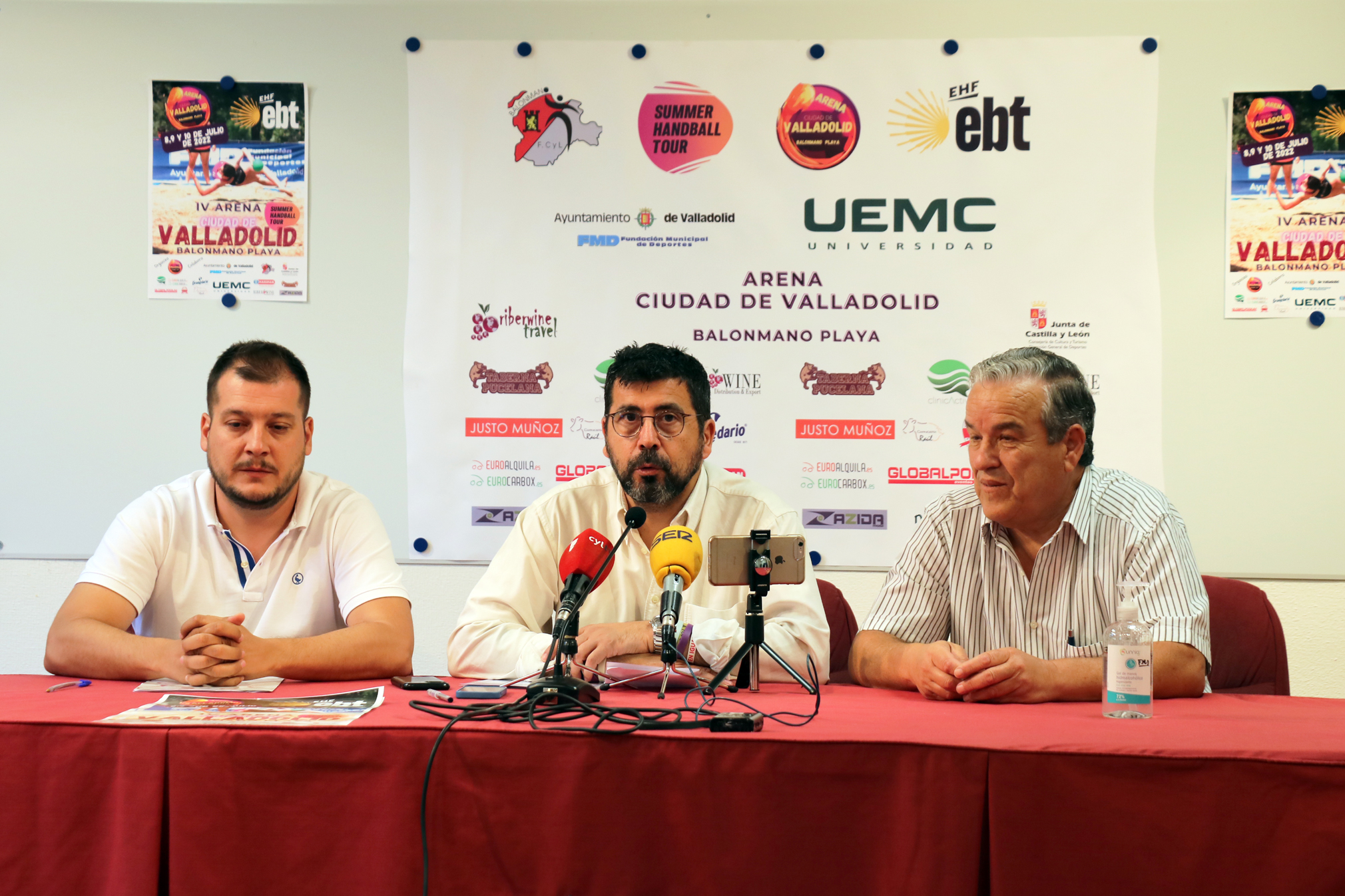El concejal de Participación Ciudadana y Deportes, Alberto Bustos, ha presentado el IV Torneo de balonmano playa Arena Handball Ciudad de Valladolid que se celebrará del 8 al 10 de julio en la playa de Las Moreras. Acompañado a Bustos han estado el presidente de la Federación de Balonmano de Castilla y León, Agustín Alonso y el organizador de esta prueba David Piquero.