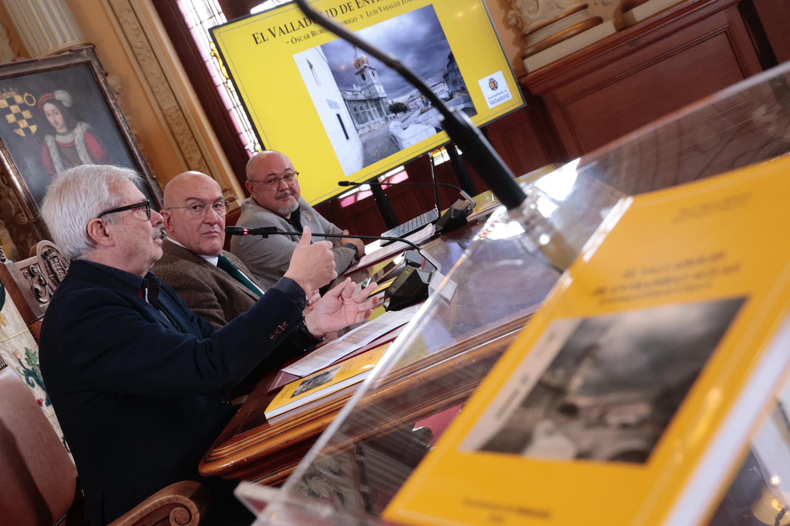 El alcalde de Valladolid, Jesús Julio Carnero, acompañado de los investigadores Óscar Burón Rodrigo y Luis Vasallo Toranzo; y el catedrático de la Universidad de Valladolid Jesús Urrea Fernández, ha participado esta mañana en el acto de presentación de ‘El Valladolid de Entrambas Aguas’, nueva publicación que se integra en la Colección de Publicaciones Municipales con el número 53.