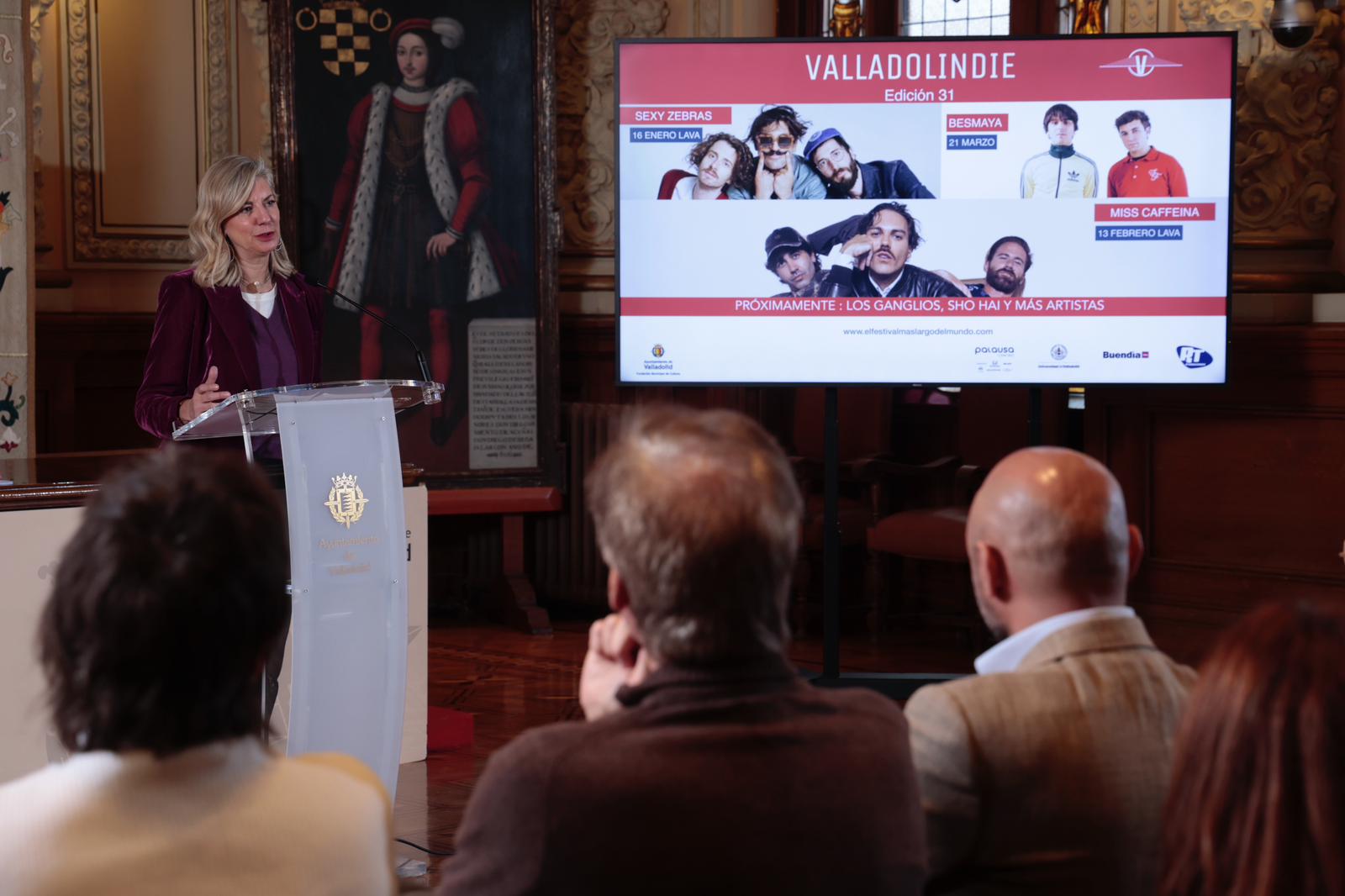 La concejala de Educación y Cultura, Irene Carvajal, ha presentado hoy en Salón de Recepciones de la Casa Consistorial la 31ª edición de Valladolindie acompañada por Roberto Terne, organizador del ciclo musical; María José Pozo, técnico de actividades culturales del Centro Buendía de la Universidad de Valladolid y Antonio Ruiz, gerente de Palausa Centro.