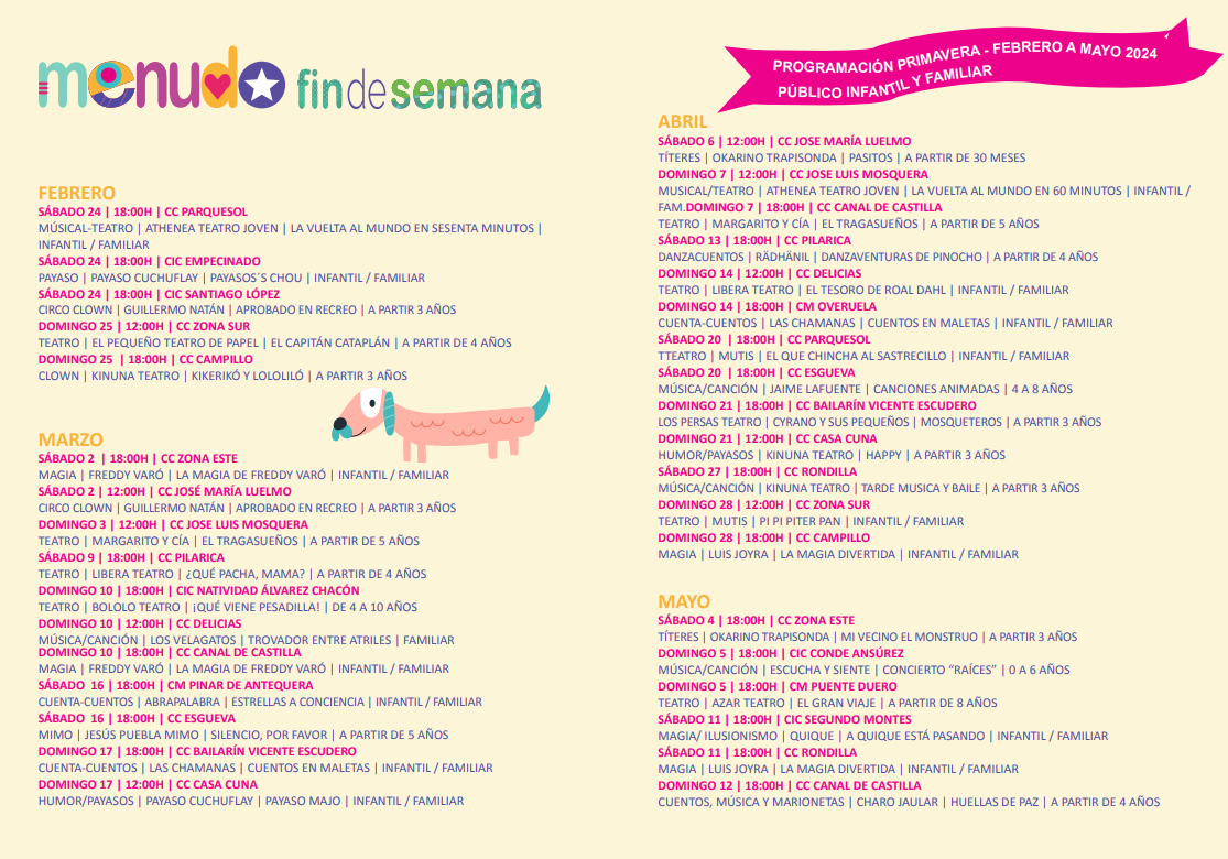 Menudo fin de semana, es un programa de ocio, arte y cultura para el público infantil y familiar que se desarrolla en los centros dependientes del Servicio de Participación Ciudadana durante el fin de semana, sábados y domingos .