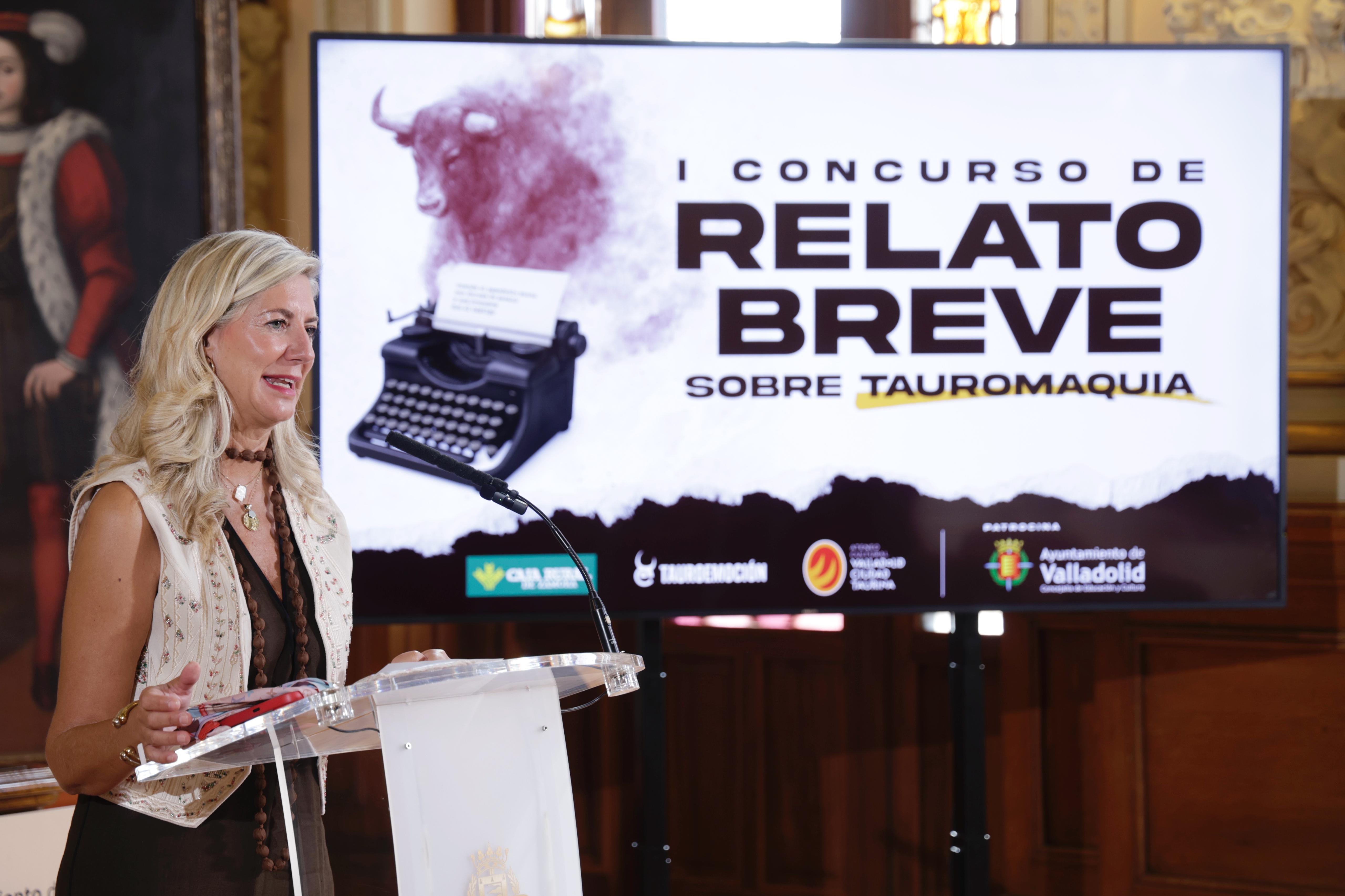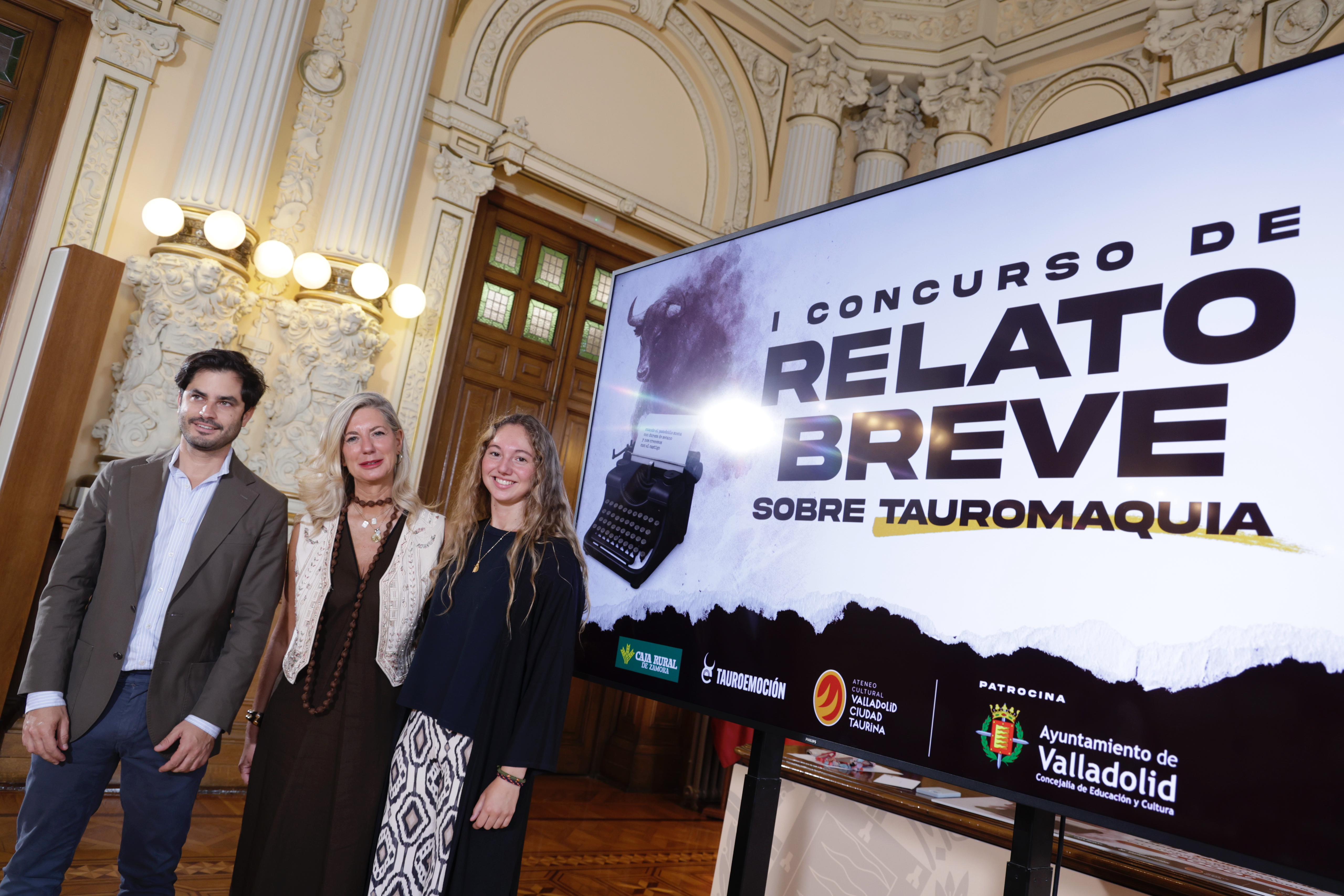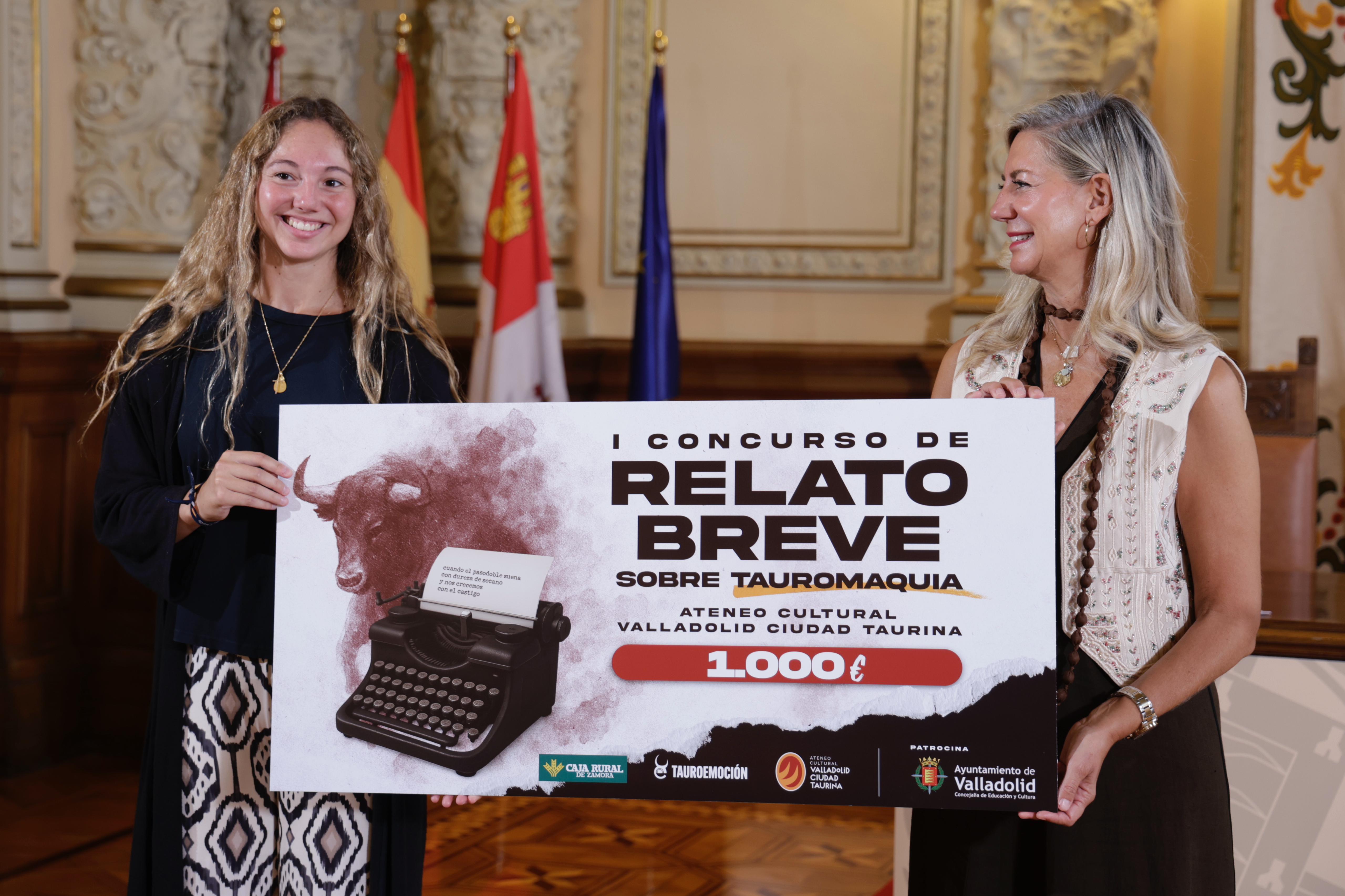 La concejala de Educación y Cultura, Irene Carvajal, ha entregado esta mañana en el Ayuntamiento de Valladolid, el premio del ‘I Concurso de Relato Breve sobre Tauromaquia, convocado por el Ateneo Cultural Valladolid Ciudad Taurina. En la entrega, la ha acompañado el director operativo de Tauroemoción, Nacho de la Viuda.