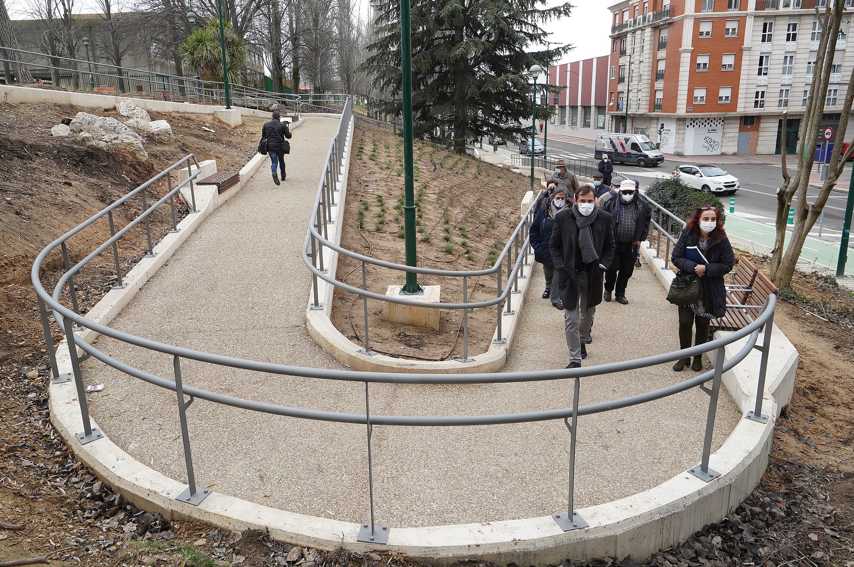 Por fin, la obra se reinició en junio de este año, y consiste en una rampa de dos metros de anchura libre en toda su longitud, formando un zigzag compuesto por ocho tramos de unos diez metros de longitud cada uno con una pendiente menor o igual al 8%, absorbiendo el total del desnivel (unos siete metros). En las mesetas de cada tramo se han colocado bancos de madera sobre prismas de hormigón blanco a modo de descansadero para las personas que así lo necesiten o deseen disfrutar de la ladera como zona estancial al igual que lo harían en el propio parque.