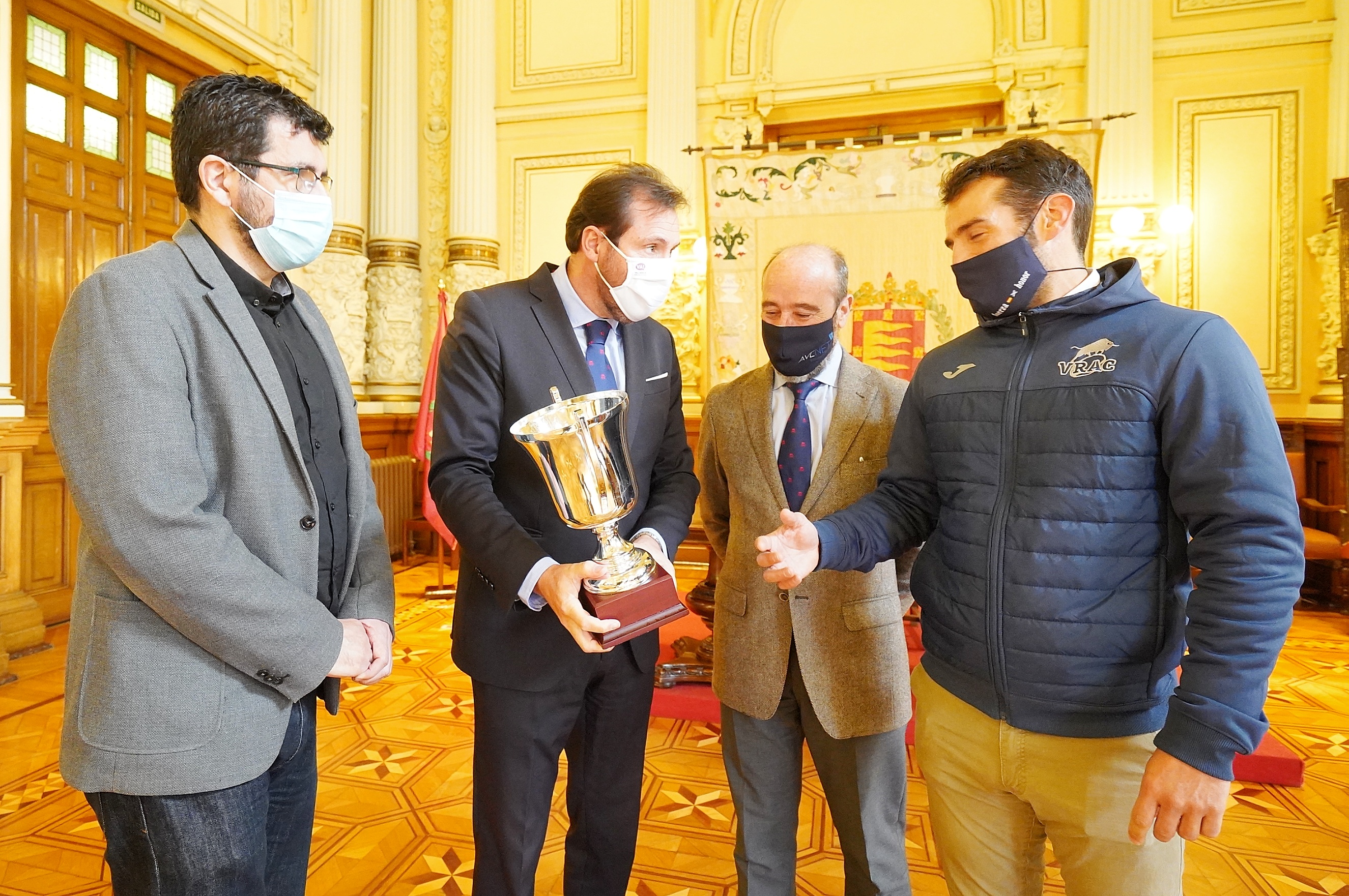 El alcalde, Óscar Puente, y el concejal de Participación Ciudadana y Deportes, Alberto Bustos, han recibido hoy en la casa consistorial al VRAC Quesos Entrepinares que se alzaba con su quinta Copa Ibérica, la cuarta consecutiva, el pasado de 27 de diciembre tras imponerse por 19 -13 al equipo portugués Os Belenenses en los campos de Pepe Rojo.