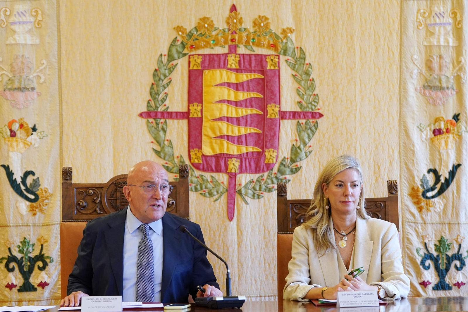 Jesús Julio Carnero e Irene Carvajal han explicado hoy, en rueda de prensa, el acuerdo para formar el Gobierno del Ayuntamiento de Valladolid para el mandato 2023-2027 y la estructura política del mismo que no varía en número respecto al mandato anterior. Habrá 10 concejalías de área y 2 delegaciones especiales.