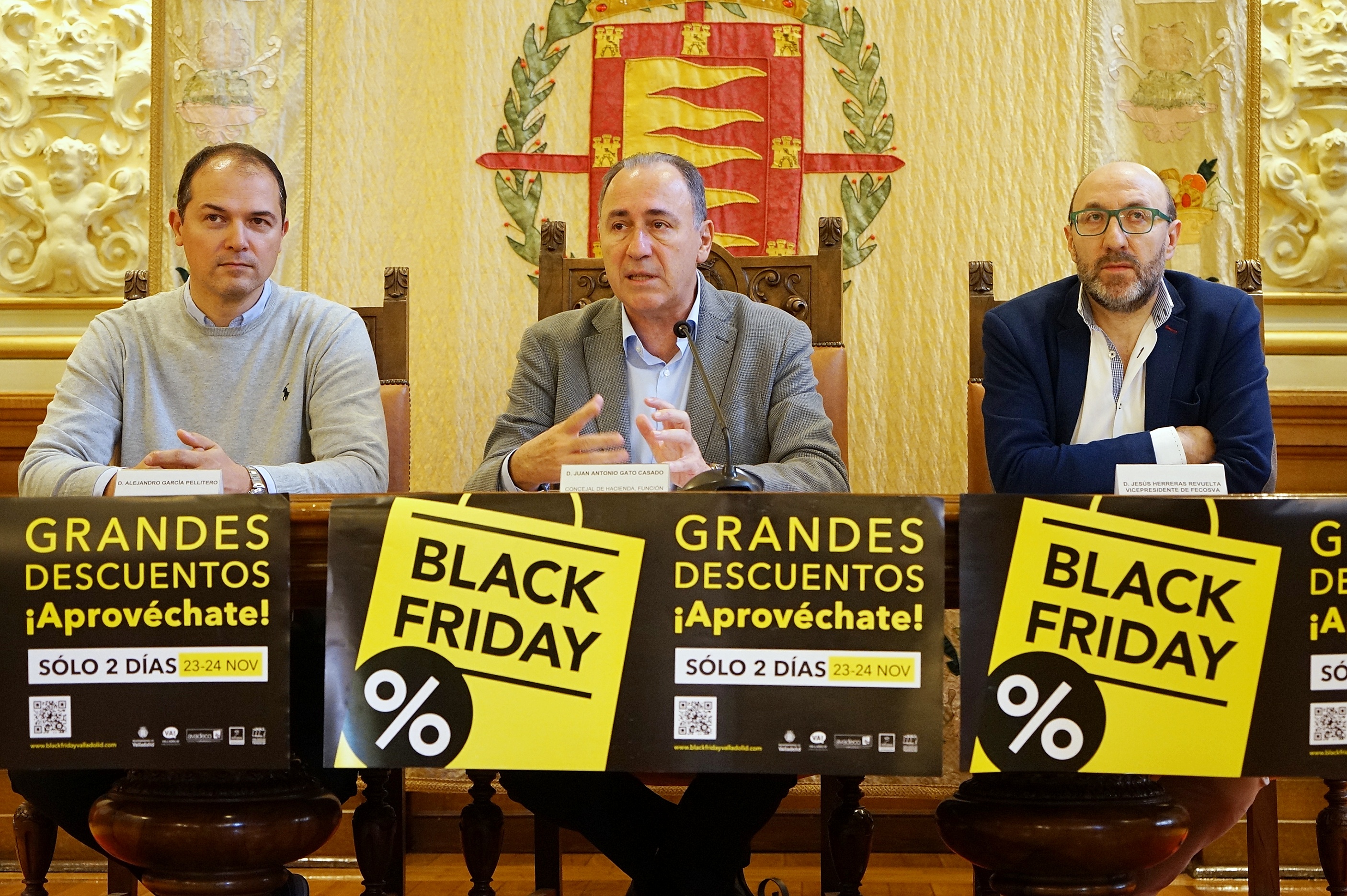 El concejal de Hacienda y Promoción Económica, Antonio Gato, el Presidente de AVADECO Alejandro Garcia Pellitero, y el Vicepresidente de FECOSVA, Jesús Herrera, presentaron este miércoles, en el Salón de Recepciones, la celebración del "Black Friday" en el comercio de proximidad de Valladolid, iniciativa que cuenta con el respaldo del Ayuntamiento y las dos asociaciones de comerciantes.