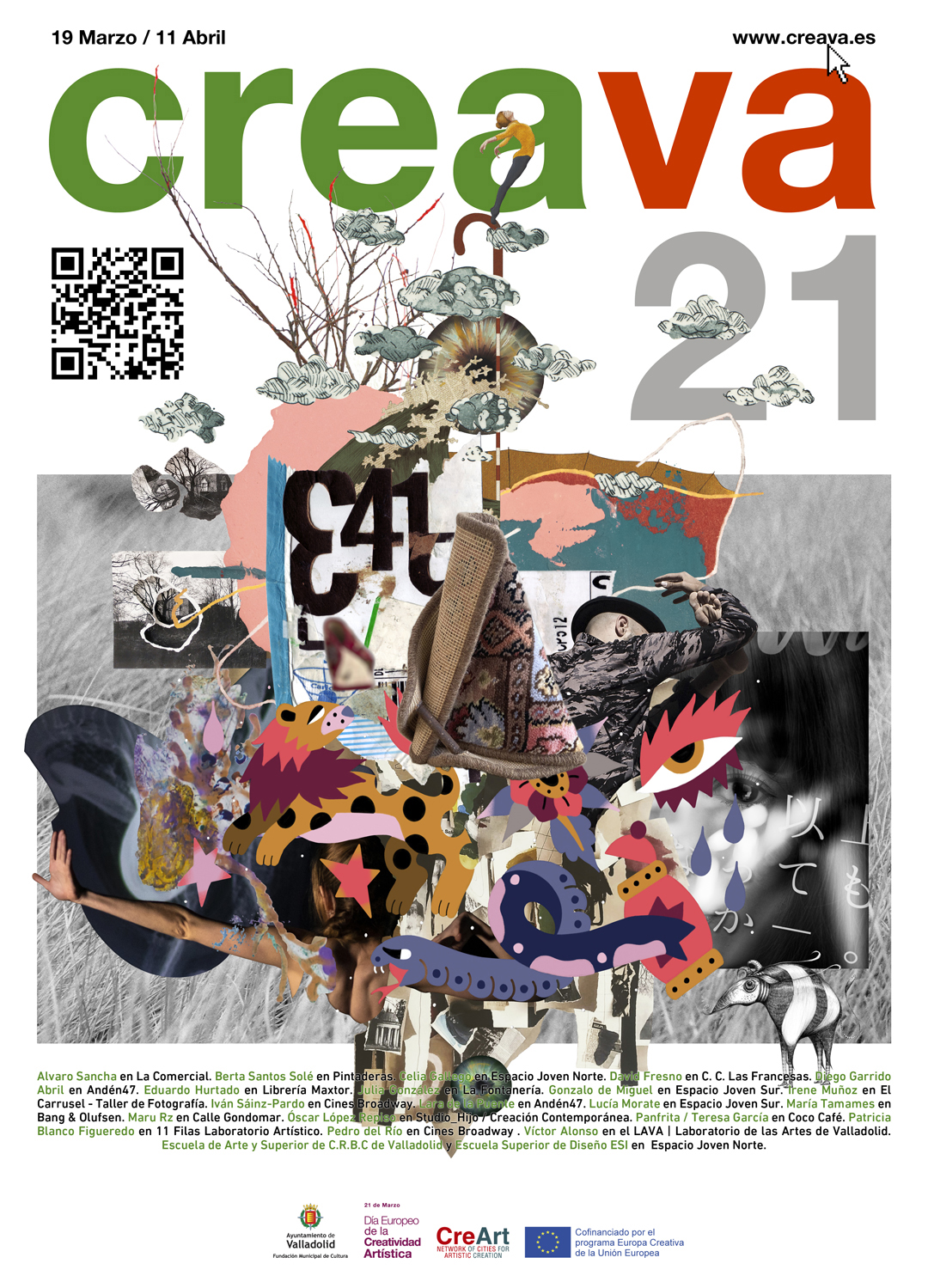 Desde el viernes 19 y hasta el 11 de abril tendrá lugar en Valladolid una nueva edición CreaVA con la participación de 19 jóvenes creadores locales, que presentarán propuestas expositivas de pintura, instalación, fotografía, vídeo, ilustración, mural…en diferentes espacios a lo largo de la ciudad; espacios de creación, comercios, bares, en el cine o en la propia calle, convirtiendo el paisaje urbano en el mejor escaparate para mostrar la variedad y calidad de la producción autóctona. CreaVAes una plataforma localsurgida hace 8 años dentro de la coordinación de la red europea CreArty como iniciativa enmarcada en el Día Europeo de La Creatividad Artística (21 de marzo). CreaVA nace con el objetivo de visibilizar la cantera de jóvenes artistas vallisoletanos, y espacios culturales y de creación no instituciones, en estrecha colaboración con el sector profesional y educativo del arte. CreaVA 21 es un proyecto comisariado por Cless y Elena Finat Sáez.