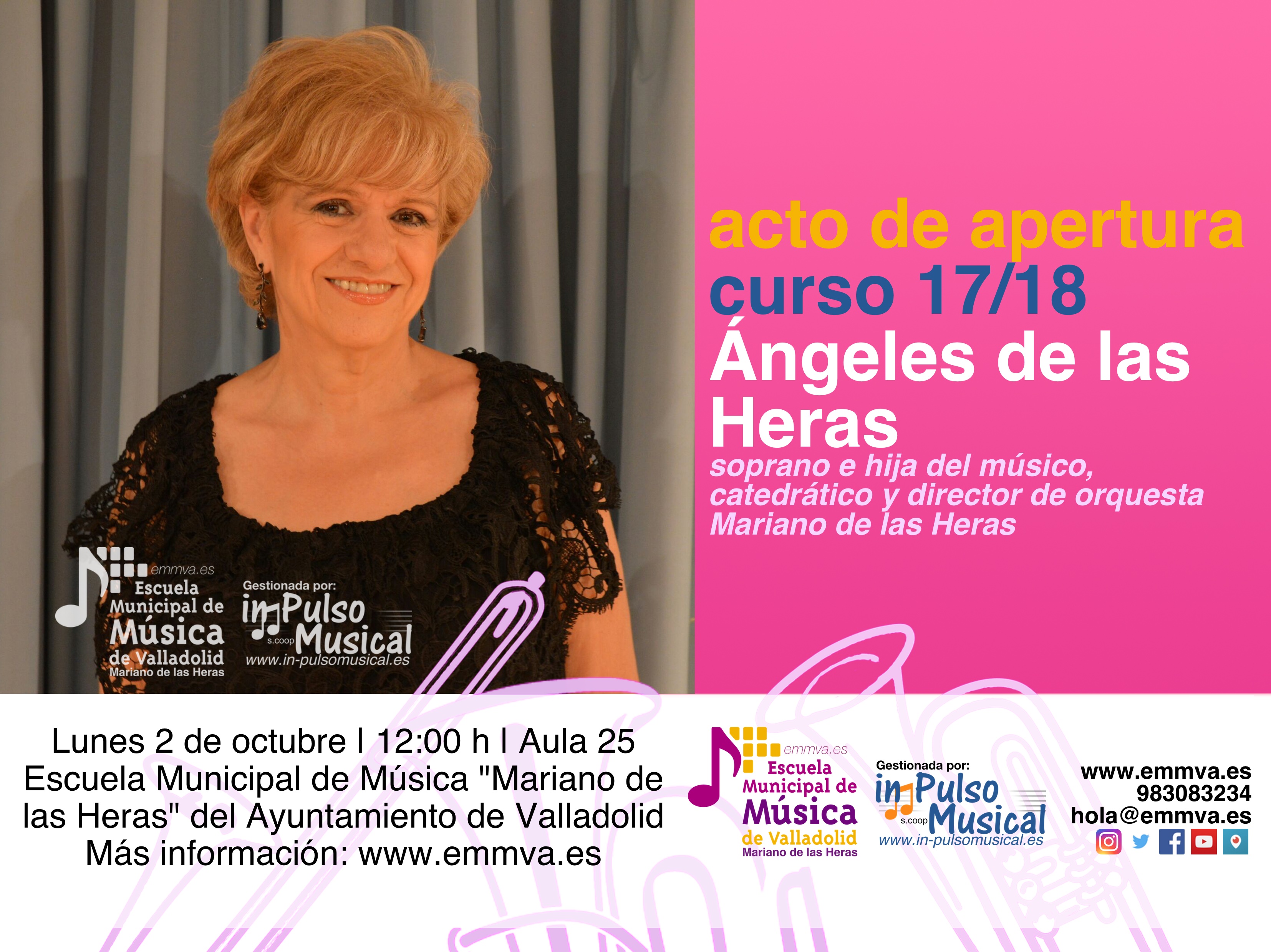 La Escuela Municipal de Música "Mariano de las Heras", del Ayuntamiento de Valladolid, celebrará el lunes 2 de octubre a las 12 del mediodía, el acto de apertura del curso 2017/2018 en el que Ángeles de las Heras, hija del músico, catedrático y director de orquesta Mariano de las Heras, realizará un repaso a la figura de su padre, su trayectoria profesional y su influencia cultural en la ciudad de Valladolid en un evento en el que también participará el Dj vallisoletano Óscar de Rivera.