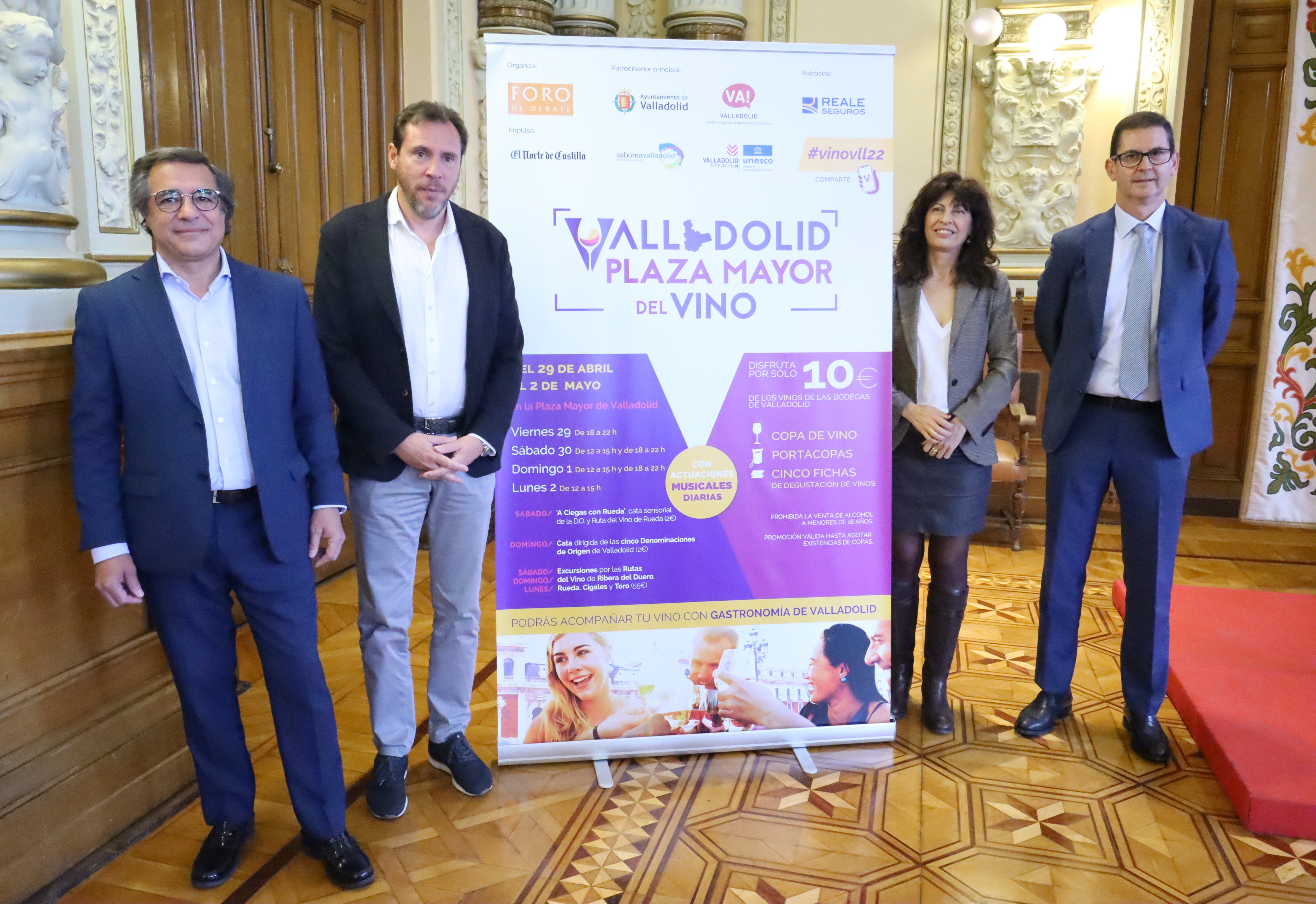 El alcalde de Valladolid, Óscar Puente; la concejala de Cultura y Turismo, Ana Redondo; el director general de El Norte de Castilla, Goyo Ezama y Manuel Salgado, delegado de Foro Debate en Castilla y León; han presentado la cuarta edición de "Valladolid. Plaza Mayor del Vino", que se celebrará del 29 de abril al 2 de mayo. Durante esos días, la Plaza Mayor se convierte en punto de encuentro de las cinco denominaciones de origen con presencia en la provincia de Valladolid.