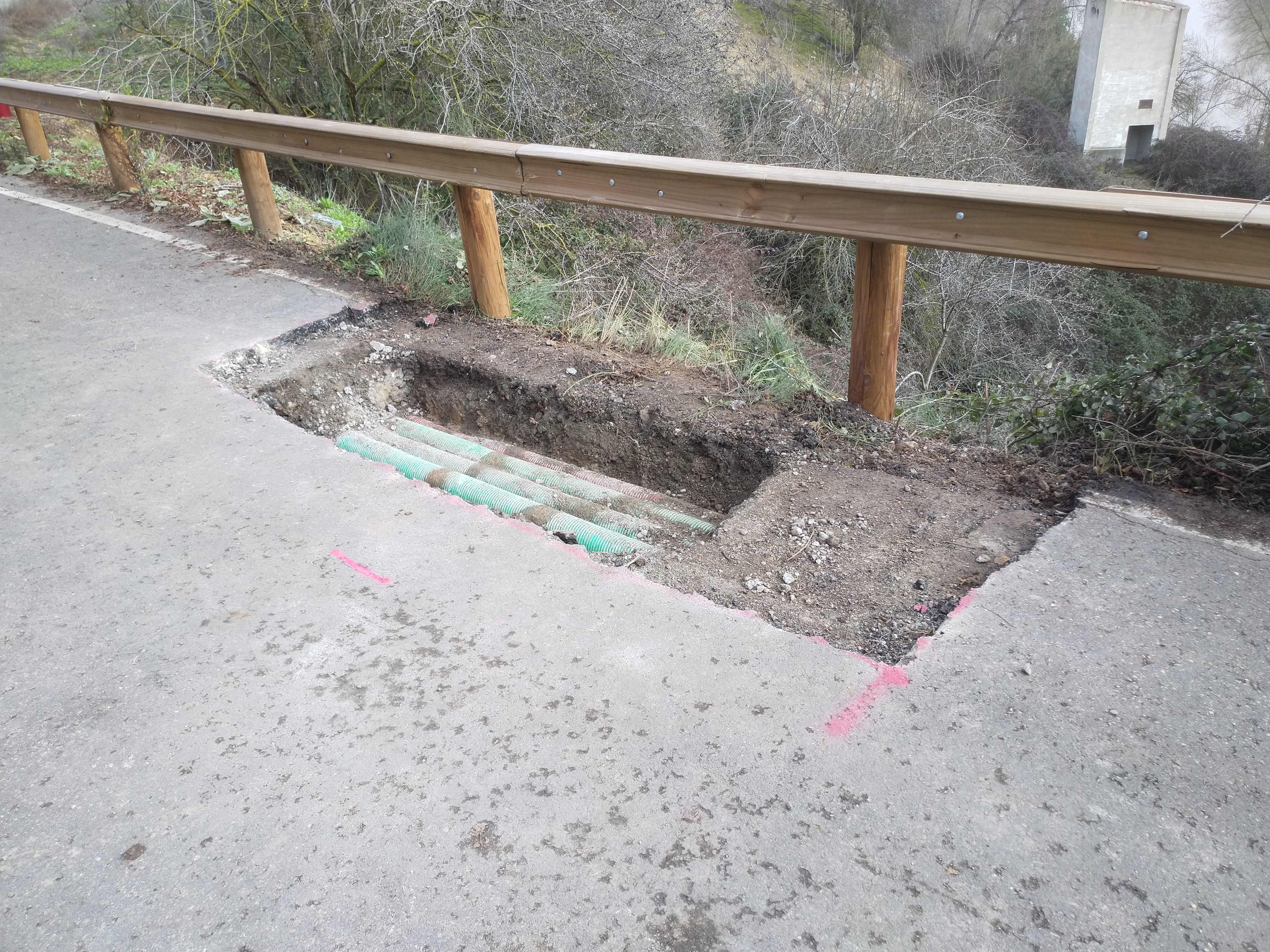 Esta misma mañana, una vez demolido el pavimento sobre la cesión aparecida en la calzada de la carretera de La Overuela, junto al puente del Berrocal, en el borde exterior de la calzada y del lado de La Overuela, puede ya afirmarse con certeza la causa de lo ocurrido: la cesión está sobre un prisma de canalizaciones de telefonía y alumbrado, muy somero y recubierto con un firme fragmentado e insuficiente para las cargas que debe soportar.