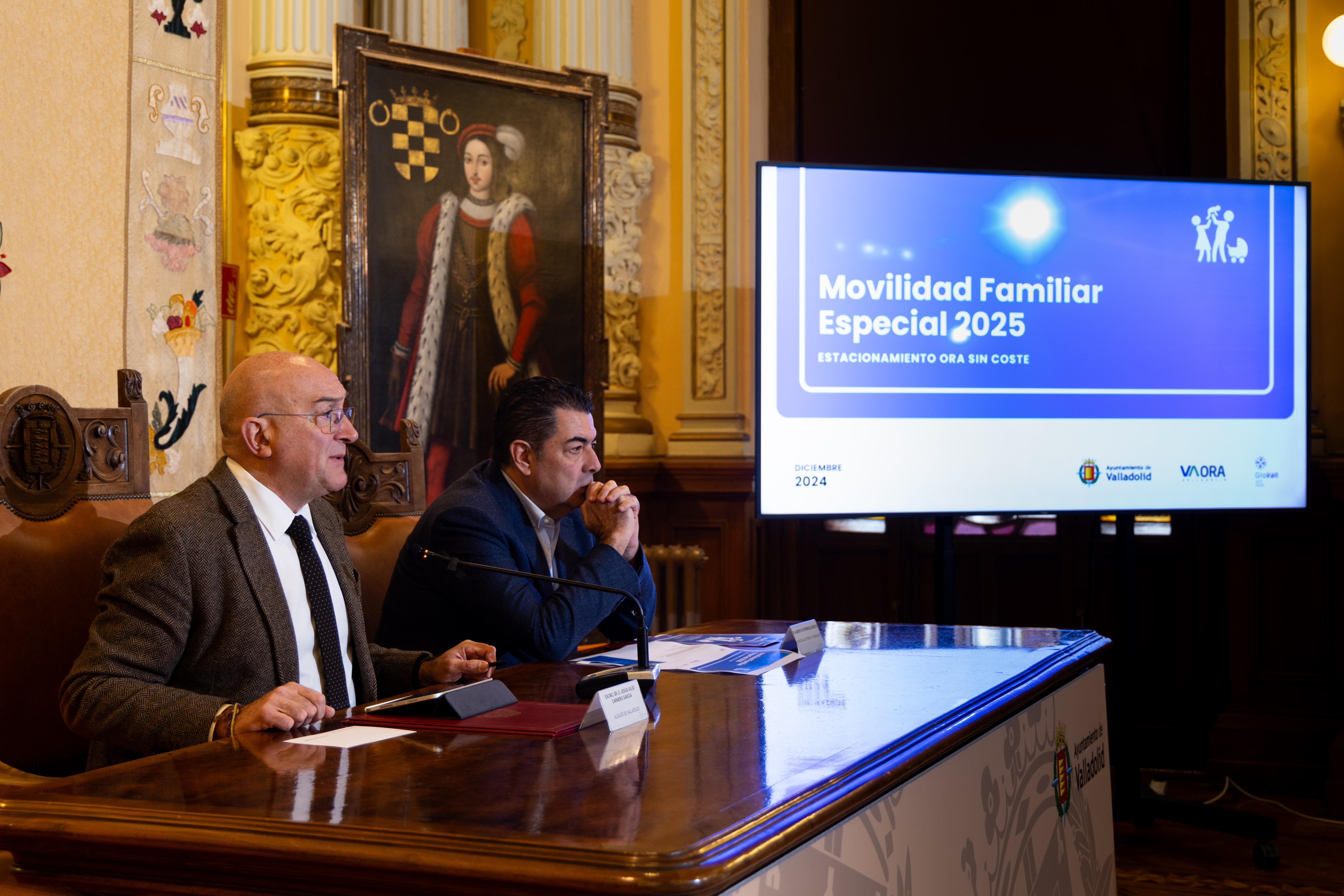 El alcalde de Valladolid, Jesús Julio Carnero, ha presentado hoy la modificación de la Ordenanza fiscal reguladora de la tasa por el estacionamiento de vehículos de tracción mecánica en las vías municipales (Ordenanza de la ORA), en beneficio de familias numerosas de categoría especial y familias con hijos menores de 3 años. La acción se desarrollará bajo el lema ‘Más familia, más movilidad’