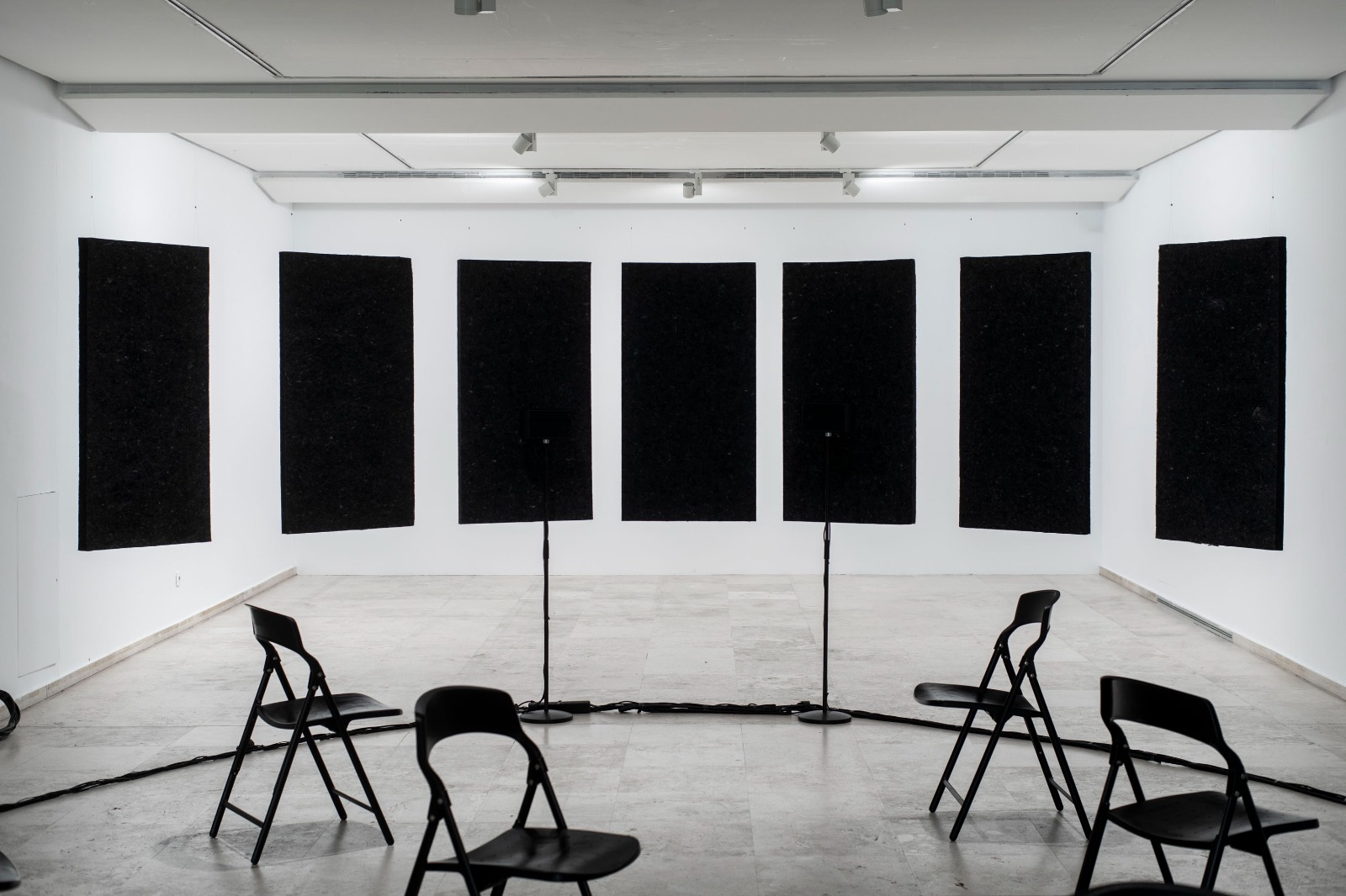 En ‘Silere, Tacere’ se plantean dos propuestas sonoras. La instalación homónima que ocupa la Sala 0 conduce al interior de un paréntesis, trazado en la cotidianeidad del espectador, que invita a la atención. La cadencia melódica de una composición ambienta, a modo de mantra, guía hacia un estado de relajación con la aspiración de inducir al silencio. Esa dimensión trascendente es la que permite la escucha profunda, imprescindible para identificar durante la audición una serie aleatoria de sonidos que Román ha grabado con antelación en las dependencias del Museo Patio Herreriano, lugar asociado a la contemplación, tanto en su actual funcionalidad como en su pasado histórico de monasterio benedictino. En el curso de este viaje atmosférico, en el que se suceden pasajes y paisajes de delicadas texturas fílmicas, se introduce también la interacción con el paseante, al incorporar sus pisadas captadas durante el recorrido.