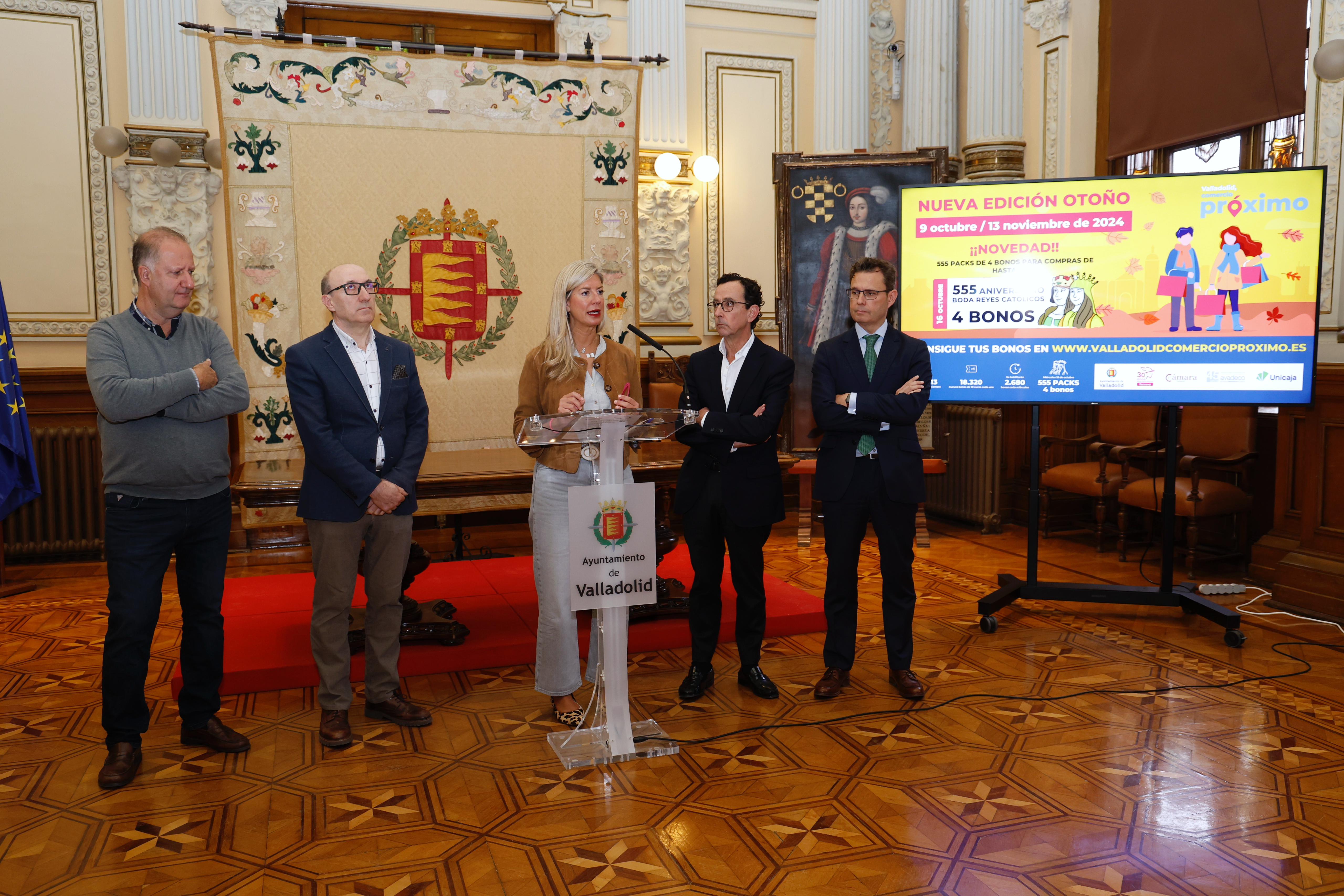 La concejala de Educación y Cultura, Irene Carvajal; el presidente de AVADECO, Rafael Monedero; el presidente de FECOSVA, Jesús Herreras; el tesorero de la Cámara de Comercio de Valladolid, Jorge Valentín-Gamazo; y el director de la Zona Valladolid Centro de Unicaja, José Manuel Matilla, han presentado en la mañana de hoy la campaña ‘Tu Bono Próximo – Otoño’ que se desarrollará desde mañana, 9 de octubre, hasta el 13 de noviembre, con el objetivo de apoyar y revitalizar las ventas en el pequeño comercio de la ciudad.