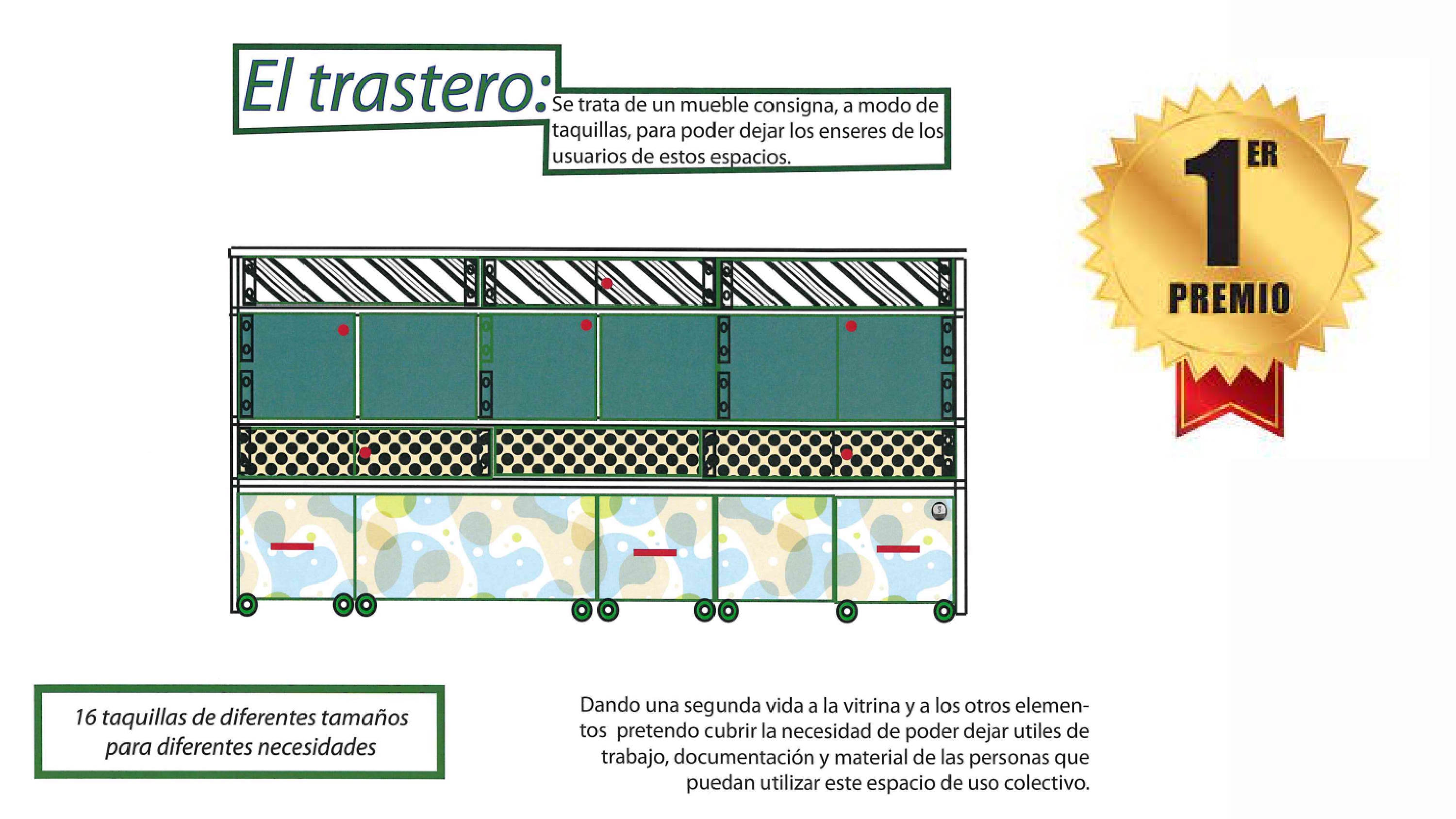La ganadora, que ha recogido su premio de manos de la concejala Charo Chávez durante esta presentación, presentó su propuesta bajo el título "El trastero", un mueble consigna a modo de taquillas para poder dejar los enseres de los usuarios. Con su diseño, logró dotar de una segunda vida a una antigua vitrina.